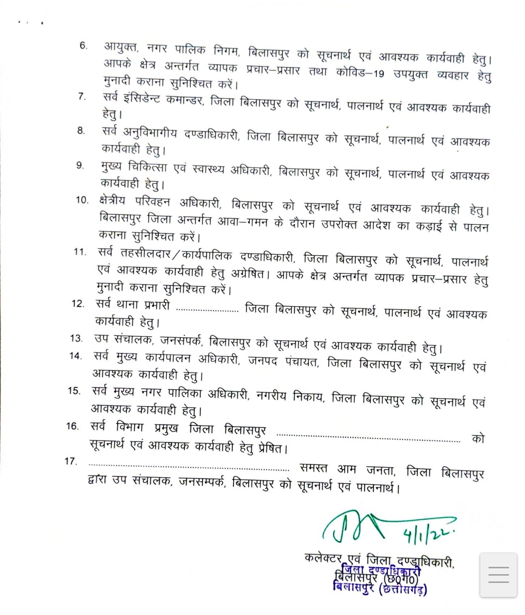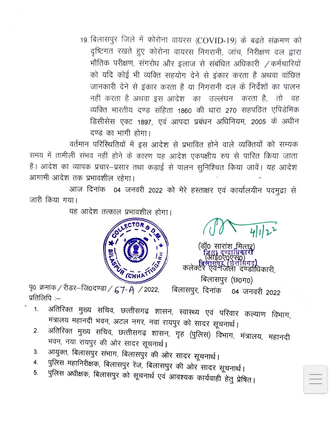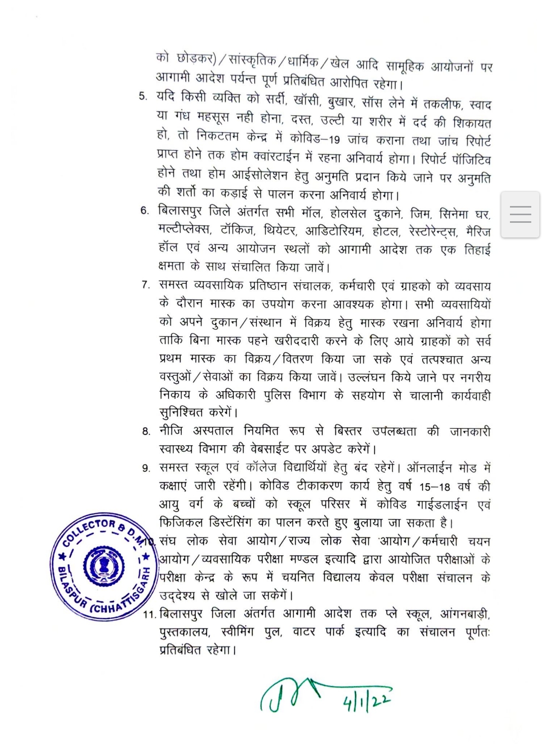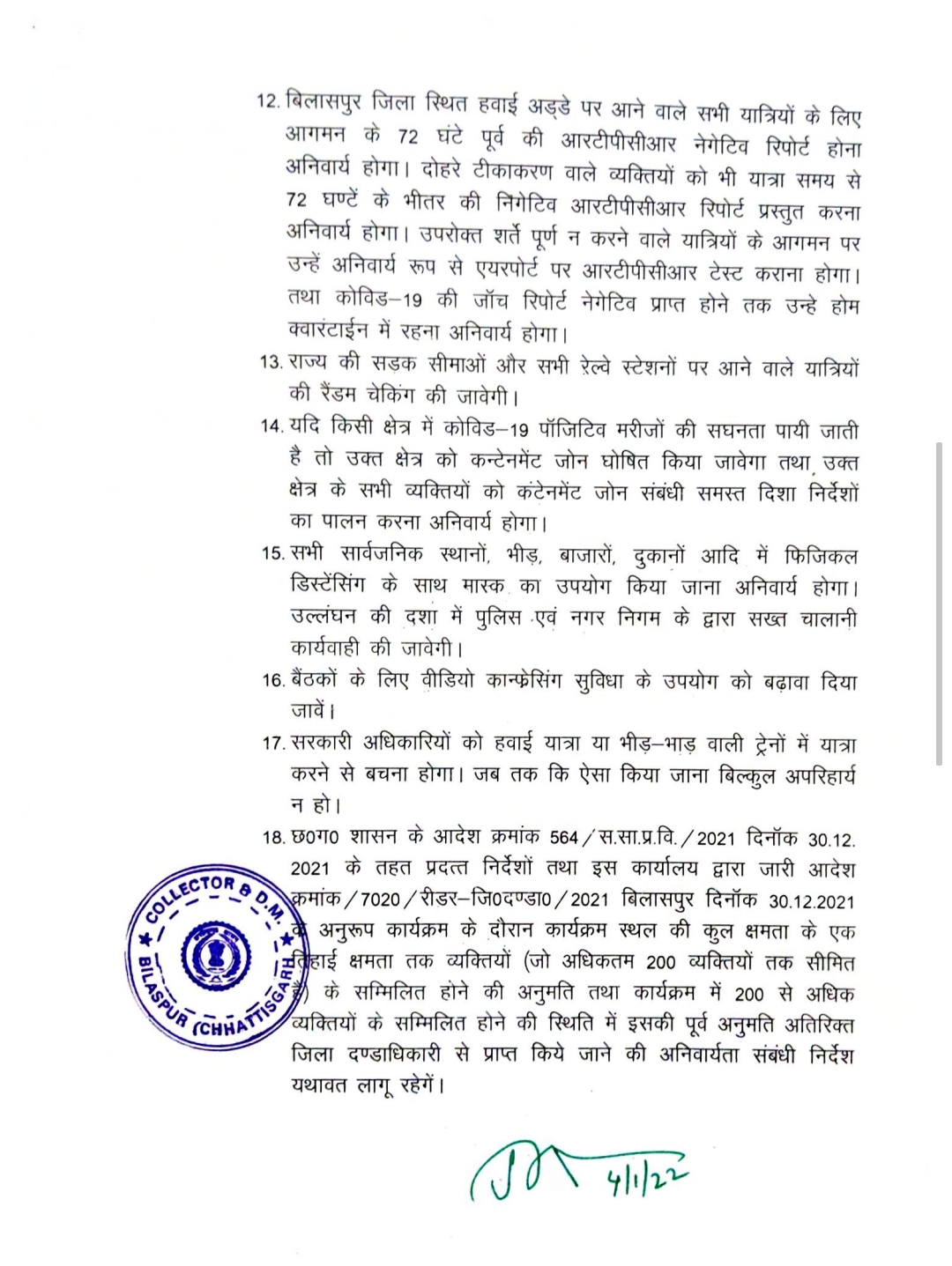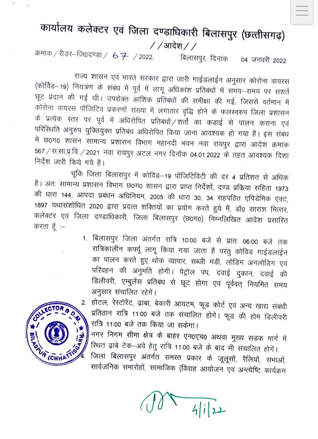 बिलासपुर-[जनहित न्यूज़] जिला दंडाधिकारी एवं कलेक्टर डॉक्टर सारांश मित्तर ने जिले में तत्काल प्रभाव से रात्रि 10 बजे से लेकर सुबह 6 बजे तक कर्फ्यू लागू करने का आदेश दिया है। सभी स्कूल कॉलेज बंद रखने का आदेश जारी किया गया है, लेकिन 15 से 18 वर्ष के विद्यार्थियों के टीकाकरण के लिये शिक्षण संस्थान सोशल डिस्टेंस के साथ खोले जा सकेंगे।