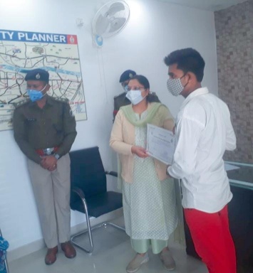 वरिष्ठ पुलिस अधीक्षक श्रीमती पारुल माथुर ने राज्यस्तरीय यातायात प्रश्नोत्तरी traffic quiz.com में प्रवीण स्थान प्राप्त करने पर कुमारी अयन्तिका सिंह एवं हितेश पटेल को प्रमाण पत्र प्रदान कर सम्मानित किया।