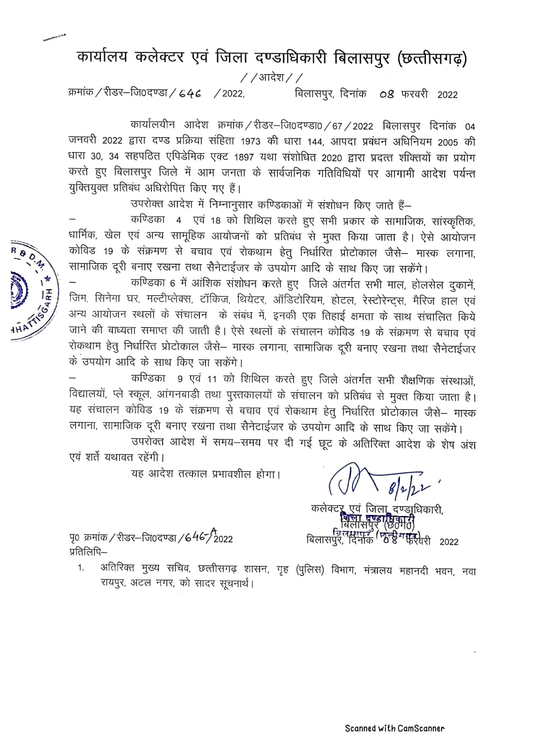 कलेक्टर द्वारा जारी निर्देश के अनुसार जिले में अब सामाजिक, धार्मिक, खेल एवं अन्य गतिविधियों को भी प्रतिबंध से मुक्त किया गया है। अब जिले में संचालित शॉपिंग मॉल, होलसेल दुकानें, थियेटर, मैरेज हॉल, होटल, रेस्टोरेंट आदि पूरी क्षमता के साथ खुलेंगी। अब इन स्थलों के एक तिहाई क्षमता के साथ संचालन की बाध्यता समाप्त कर दी गयी है।