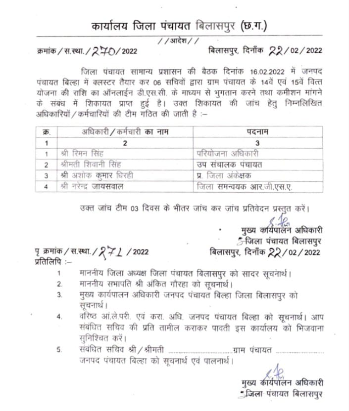 121 सचिवों का काम 6 सचिवों से जबकि मामले में जिला पंचायत सभापति अंकित गौरहा ने प्रमाण पेश कर बताया कि सीईओ के इशारे पर कमीशनखोरी को अँजाम 6 ग्राम पंचायत सचिव मिलकर कर रहे हैं। मामले में अंकित गौरहा ने यह भी बताया कि बिल्हा में कुल 127 सचिव है। लेकिन सभी क्षेत्रों में कराए गए काम का भुगतान सिर्फ 6 सचिव ही करते हैं। खुद सीईओ ने 6 सचिवों वाली क्लस्टर कमेटी को भंग करने का आदेश दिया है। सवाल उठता है कि कमेटी कब और किसके आदेश पर बनाया गया। शायद इसका आदेश भी होगा। अंकित ने यह भी बताया कि उनके पास क्षेत्र के तमाम सरपंच और सचिवों की लिखित शिकायत है। शिकायत को सामान्य सभा की बैठक में भी उठाया है।