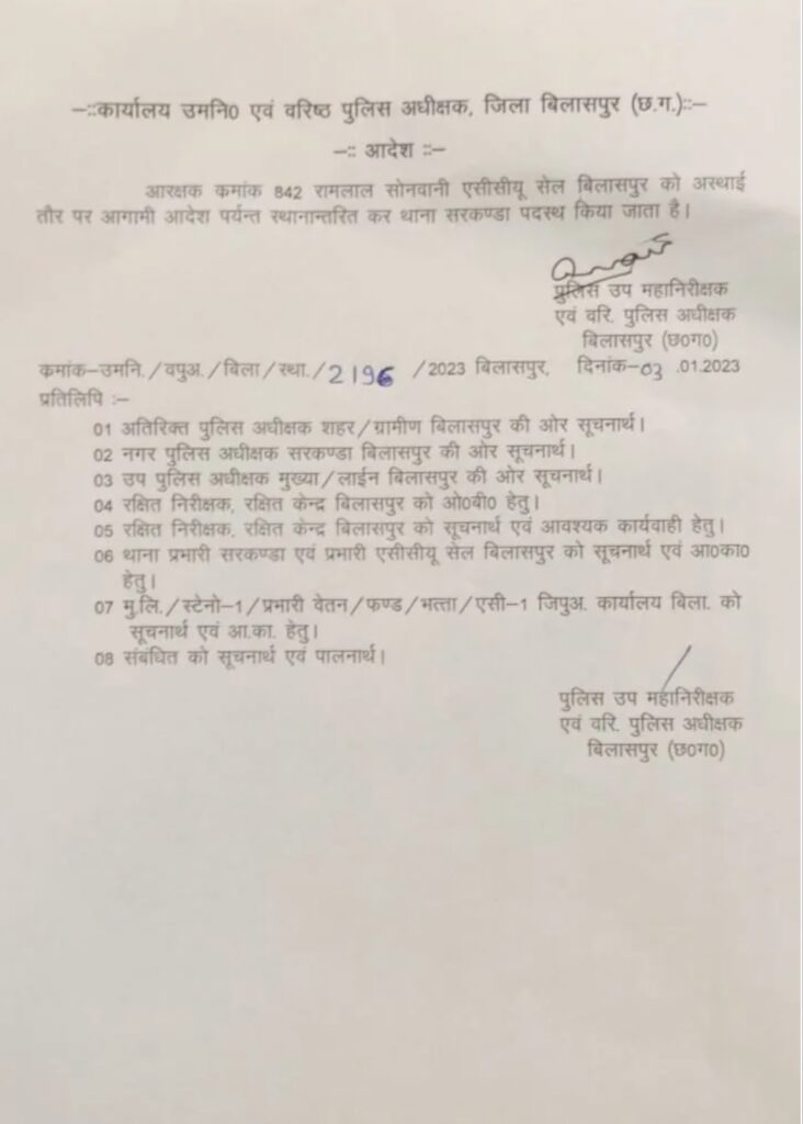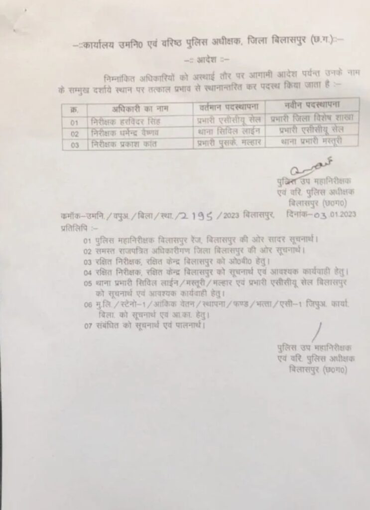 बिलासपुर-{जनहित न्यूज़} बिलासपुर एसएसपी पारुल माथुर ने तीन निरीक्षकों का तबादला किया वही ACCU प्रभारी हरविंदर सिंह की जगह निरीक्षक धर्मेंद्र वैष्णव को ACCU प्रभारी बनाया गया है।