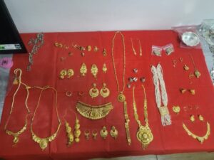 बरामद मशरूका सोने के जेवर नेकलेश 21.660 ग्राम, चांदी का पायल 48.220 ग्राम, सोने का चैन 32.400 ग्राम, सोने का लाॅकेट 6.350 ग्राम, सोने का चैन टाॅप्स 4.030 ग्राम, सोने का रिंग 9.240 ग्राम, सोने का रिंग 11.860 ग्राम, सोने का नेकलेश 43.170 ग्राम, सोने का नेकलेश 40.790 ग्राम, सोने का रिंग 15.810 ग्राम, चांदी का पायल 379.55 ग्राम, चांदी का बिछिया 34.25 ग्राम, चांदी का पायल 191 ग्राम व सोने चांदी के अन्य आभुषण एवं कुल करीब 35 तोला सोना व करीब 03 किलो चांदी के आभुषण, 01 नग सोनी एल.ई.डी. टी.वी., 02 नग मोटर सायकल 05 नग स्मार्ट फोन, 02 नग हाथ घडी, एवं नगदी रकम 24000 रू। कुल कीमती 26 लाख रू