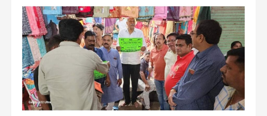 लआज की बैठक में बिलासपुर मर्चेंट एसोसिएशन के अध्यक्ष विनोद मेघानी कार्यकारी अध्यक्ष नानक खाटूजा कोषाध्यक्ष जयप्रकाश मित्तल संरक्षक सुनील संथालिया कमल विधानी पवन वाधवानी के अलावा अनेक सदस्य मौजूद थे सभी ने 7 अप्रैल को पूरे दिन अपनी दुकानें बंद रखने का निर्णय लिया है।