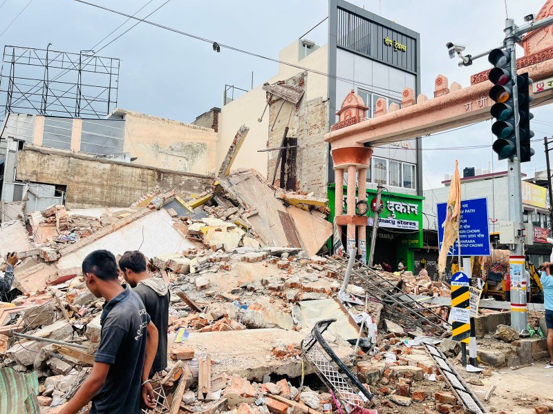 मिली जानकारी के अनुसार मंगला चौक पर विगत दिनों से सड़क पर नगर निगम द्वारा नाली निर्माण का कार्य चल रहा है वही चौक मे कॉर्नर में श्रीराम मेडिकल स्टोर की तीन मंजिला बिल्डिंग आज सुबह 6.45 में देखते ही देखते ध्वस्त हो गई। इस बिल्डिंग की नींव के पास महीनों से नाली निर्माण कार्य किया जा रहा था जिसके चलते पूरी बिल्डिंग भरभरा कर गिर गई।