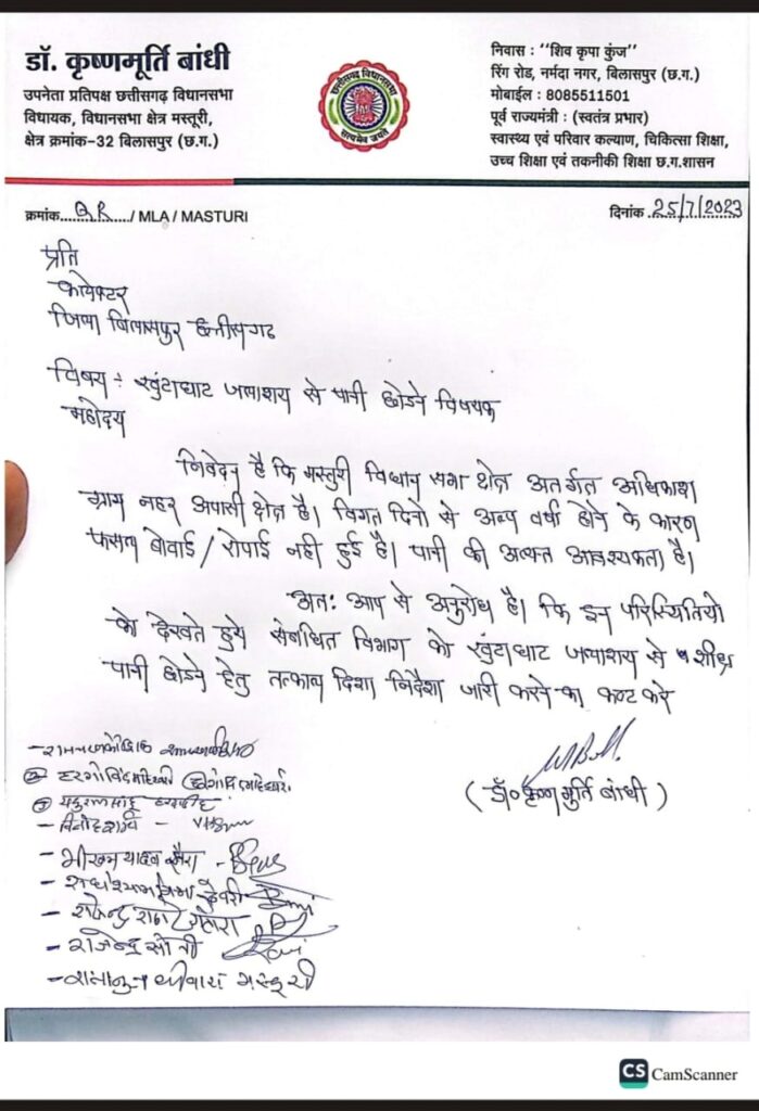 मस्तूरी विधानसभा क्षेत्र में क्षेत्रवासियों को जल की समस्या का सामना ना करना पड़े यह सोचकर मस्तूरी विधायक डॉक्टर कृष्णमूर्ति बांधी लगातार प्रयास कर रहे हैं। हाल ही में डॉ.बांधी ने अल्प वर्षा के कारण किसानों पर गुजर रही सिंचाई की समस्या को ध्यान में रखते हुए, बिलासपुर जिलाधीश को खूँटाघाट जलाशय से नहर में पानी छोड़ने को लेकर ज्ञापन सौंपे थे, जिसके महज 2 दिनों बाद ही खुटाघाट जलाशय से नहर में पानी छोड़ दिया गया। वही जल जीवन मिशन के कार्यों में लापरवाही को लेकर भी विधायक डॉक्टर बांधी ने भाजपा कार्यकर्ताओं के साथ मिलकर एक दिवसीय आंदोलन किया और मस्तूरी एसडीएम को मुख्यमंत्री भूपेश बघेल के नाम ज्ञापन सौंपा, जिसके महज 4 दिनों बाद प्रशासनिक अधिकारियों ने ठेकेदारों की बैठक लेकर फटकार लगाते हुए निर्देश दिए।