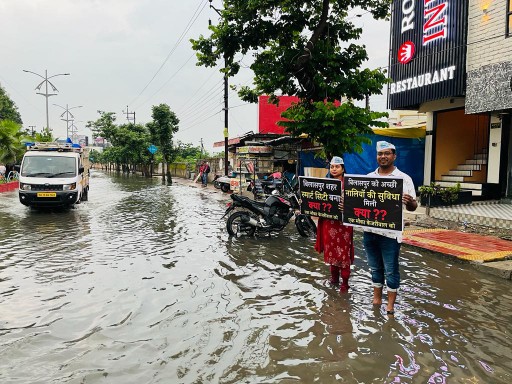 और निगम प्रशासन को जमकर खरी-खोटी सुनाई सड़क पर भरे पानी में उतर कर किया। अनोखा प्रदर्शन आप पार्टी की उज्वला कराड़े ने शुक्रवार को श्रीकांत वर्मा मार्ग पर भारी बारिश के चलते सड़क पर भरे पानी में पैदल चलकर विरोध करती नजर आई इस दौरान उन्होने निगम प्रशासन पर जमकर प्रहार किया उन्होंने बताया कि उसके 5 साल में कांग्रेस सरकार स्मार्ट सिटी पर कोई काम कर पाई और ना पूर्ववर्ती सरकार ने इस ओर कोई ध्यान नहीं दिया।