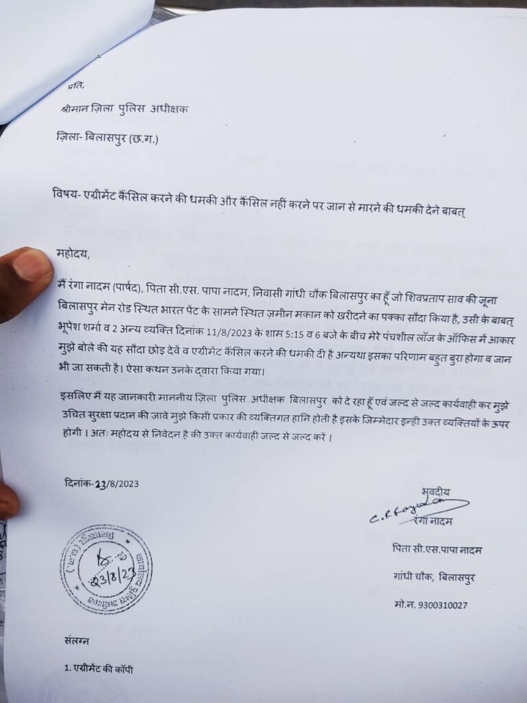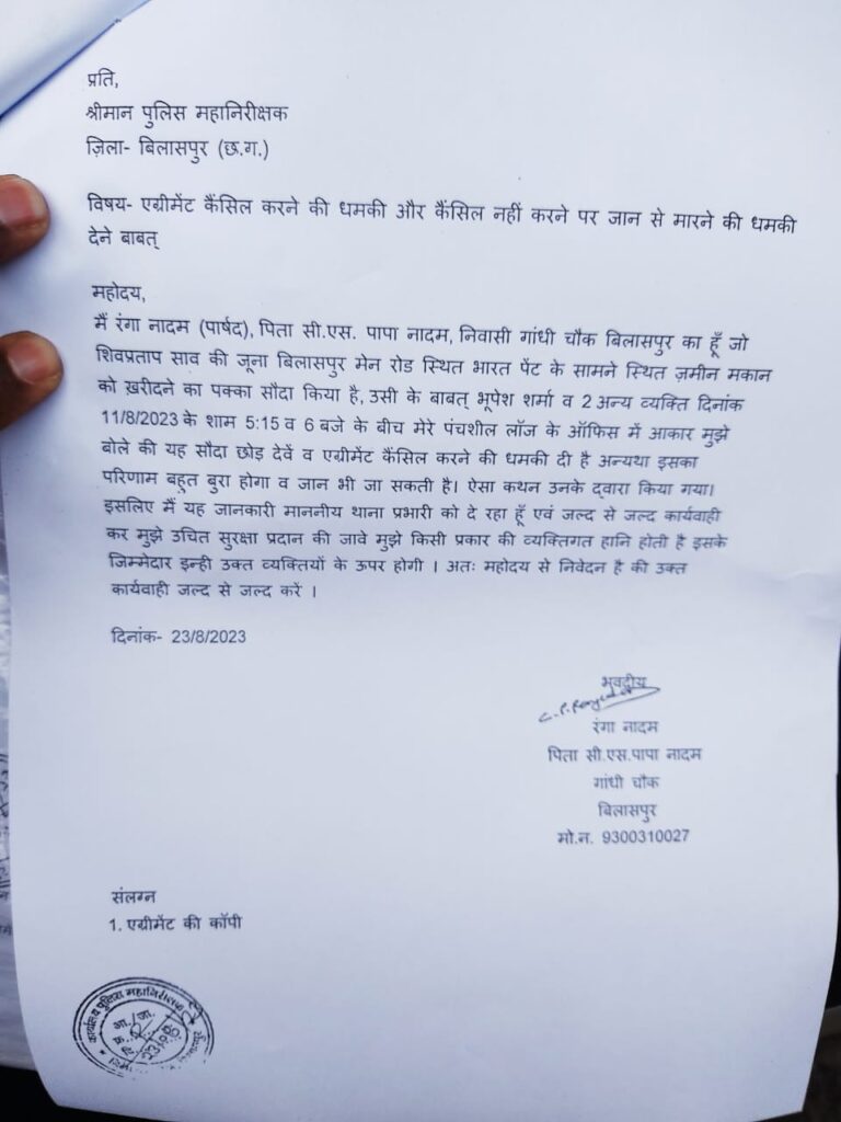 भूपेश शर्मा और उसके दो साथी भी सौदे को खरीदना चाहता था पर खरीद नही सके जिसका खुन्नस मन रखे हुए। 11/08/23 को शाम 5.15 पीएम से 6 पीएम के बीच पंचशील लाज के ऑफिस में आकर मुझे धमकाने लगे… कहने लगे की मेरे द्वारा किए गए अनुबंध को निरस्त कर वर्ना तेरे लिए अच्छा नहीं होगा तेरी जान भी जासकती है। पीड़ित ने यह भी बताया की पुलिस द्वारा कार्यवाही होता न देख खुद पता लगाया की भूपेश शर्मा के साथ आए दो साथी विशाल खंडेवाल रायपुर और आलोक पांडे तोरवा का रहने वाला है। जिसकी शिकायत विधिवत मेरे द्वारा 11/08/23 थाना प्रभारी को की गई। मेरे द्वारा थाना प्रभारी से बार-बार गुहार लगाने के बाद भी कोई कार्यवाही होता न देख मेरे द्वारा दिनांक 23/08/23 को पुलिस अधीक्षक बिलासपुर और पुलिस महानिरीक्षक बिलासपुर रेंज से शिकायत की पर समाचार लिखे जाने तक कोई भी कार्यवाही पुलिस द्वारा धमकी देने वाले भूपेश शर्मा व उनके दो साथियों पर नहीं को गई है।