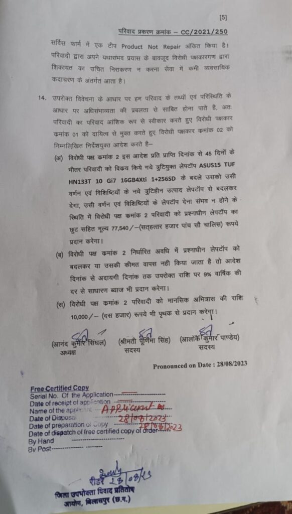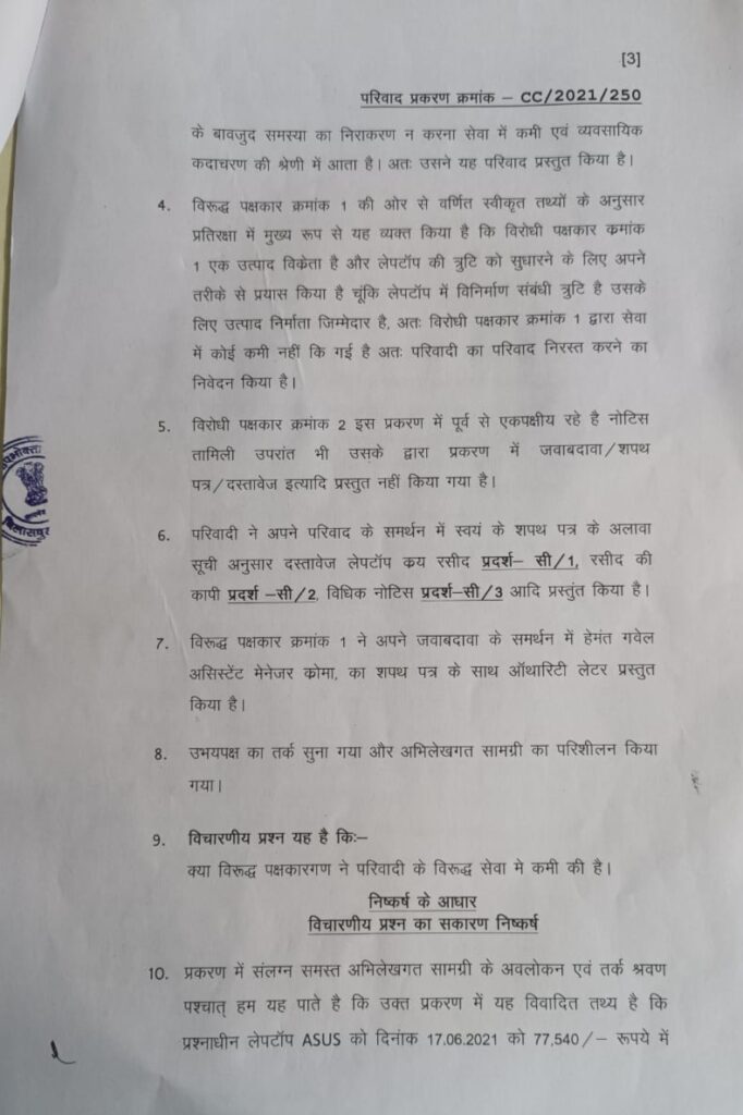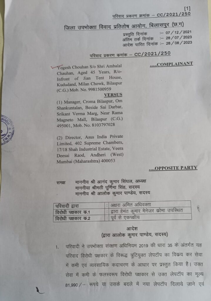बिलासपुर-[जनहित न्यूज़] उपभोक्ता फोरम न्यायालय ने क्रोमा कंपनी शो रूम से खरीदी ऐशस कंपनी की खराब लेपटॉप बेचने बेचने पर 10 हजार रु.का जुर्माना ठोंका है, साथ ही कंपनी को नया लेपटॉप या फिर 9प्रतिशत की दर से ब्याज अदायगी करने का निर्देश दिया है।