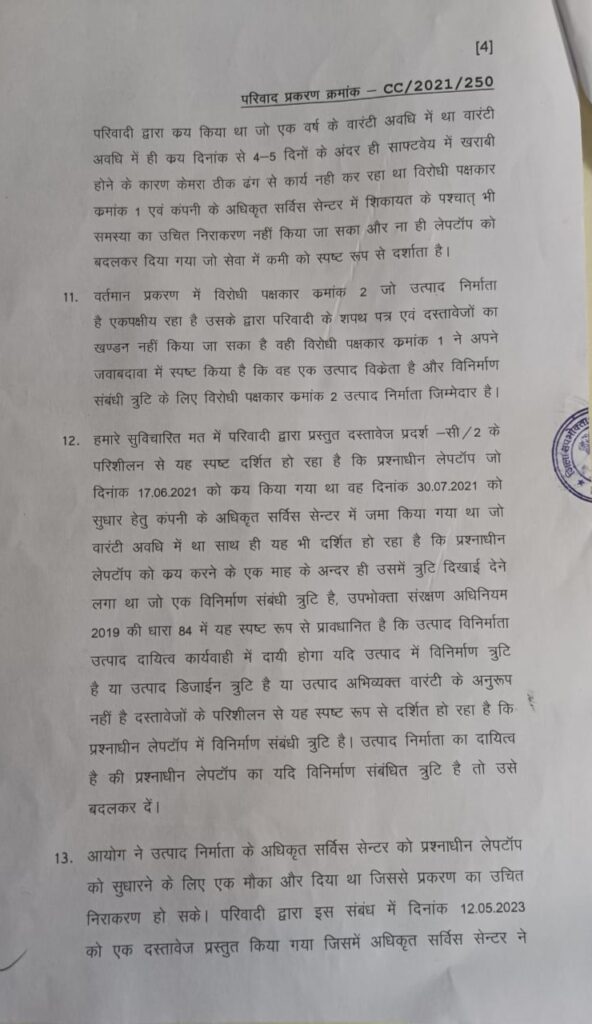 विस्तृत विवरण इस प्रकार है कि कुडुदंड मिलन चौक निवासी मुकेश चौहान पिता अंबालाल चौहान ने मैग्नेटो मॉल समीप “क्रोमा शो रूम” से 17 जून 21 को ऐशस कंपनी का एक लेपटॉप 77 हजार 540 रू.में खरीदा था और खरीदी के पांच दिन के बाद ही लेपटॉप खराब हो गया। जिसकी शिकायत चौहान ने क्रोमा शो रूम में जाकर की और बनाने को कहा लेकिन अनेकों बार बनाने के बाद भी खराब लेपटॉप बन नही सका अंततः उपभोक्ता ने न्यायालय की शरण में गया। जहा फोरम ने उपभोक्ता श्री चौहान के पक्ष में फैसला सुनाते हुए 10 हजार रूपए जुर्माना के साथ नया। लेपटॉप उपलब्ध कराने के साथ में 9प्रतिशत की दर से ब्याज भी देने को कहा है। उपभोक्ता की तरफ से अक्षरा अमित हाईकोर्ट अधिवक्ता ने पैरवी की है।