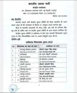 बिलासपुर-रायपुर{जनहित न्यूज़} भारत निर्वाचन आयोग द्वारा 5 राज्यों के चुनाव की तारीखों का ऐलान करते ही भाजपा की केंद्रीय इकाई ने छत्तीसगढ़ भाजपा की दूसरी सूची जारी कर दी। इसमें 64 नाम शामिल हैं। पहली सूची में भाजपा 21 उम्मीदवार घोषित कर चुकी है। अब सिर्फ 5 सीटों के भाजपा उम्मीदवार घोषित होना शेष है।