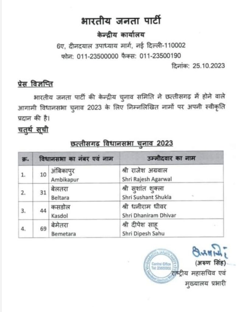 भाजपा की चौथी लिस्ट हुई जारी…बेलतरा से सुशांत कसडोल से धनीराम बेमेतरा से दीपेश साहू और अंबिकापुर से राजेश अग्रवाल होंगे प्रत्याशी…