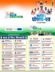 घोषणा पत्र जारी करते हुए विजय पांडेय ने कहा कि 2023 – 2028 की यह घोषणा पत्र 2018 की घोषणा पत्र की पार्ट -2 है , 2018 में कांग्रेस ने जो कहा वो किया। उसे आगे बढ़ाते हुए लोक हितकारी घोषणा पत्र है जिसमे सभी वर्गों को ध्यान में रखकर बनाया गया है। केंद्र सरकार के कारण बढ़ती महंगाई को कम करने की दृष्टि से 500 रुपये प्रति सिलेंडर सब्सिडी दी जाएगी, इस बार 3200 रुपये समर्थन मूल्य में धान खरीदा जाएगा जो 01 नवम्बर से लागू रहेगा , किसानों को बड़ी राहत देते हुए उनका ऋण माफ किया जाएगा, स्वास्थ्य सेवा में बीपीएल धारको को 10 लाख तक एवं एपीएल धारको को 5 लाख रुपये तक मुफ्त इलाज ,63 वनोत्पाद को एमएसपी में खरीदी ,केजी से लेकर पीजी तक निशुल्क शिक्षा जिसमे मेडिकल और इंजीनियरिंग की शिक्षा भी शामिल है,स्वसहायता समूहों का कर्ज माफी ,तिवरा की खरीदी समर्थन मूल्य में होगी, सड़क दुर्घटनाओं में पीड़ितों की निशुल्क इलाज,छत्तीसगढ़ के सभीहायर सेकेंडरी स्कूलों को आत्मानन्द स्कूल में विकसित करना ,ग्रामीण क्षेत्रो में उद्योगों को बढ़ावा देने के लिए 700 रीपा की स्थापना की जाएगी।