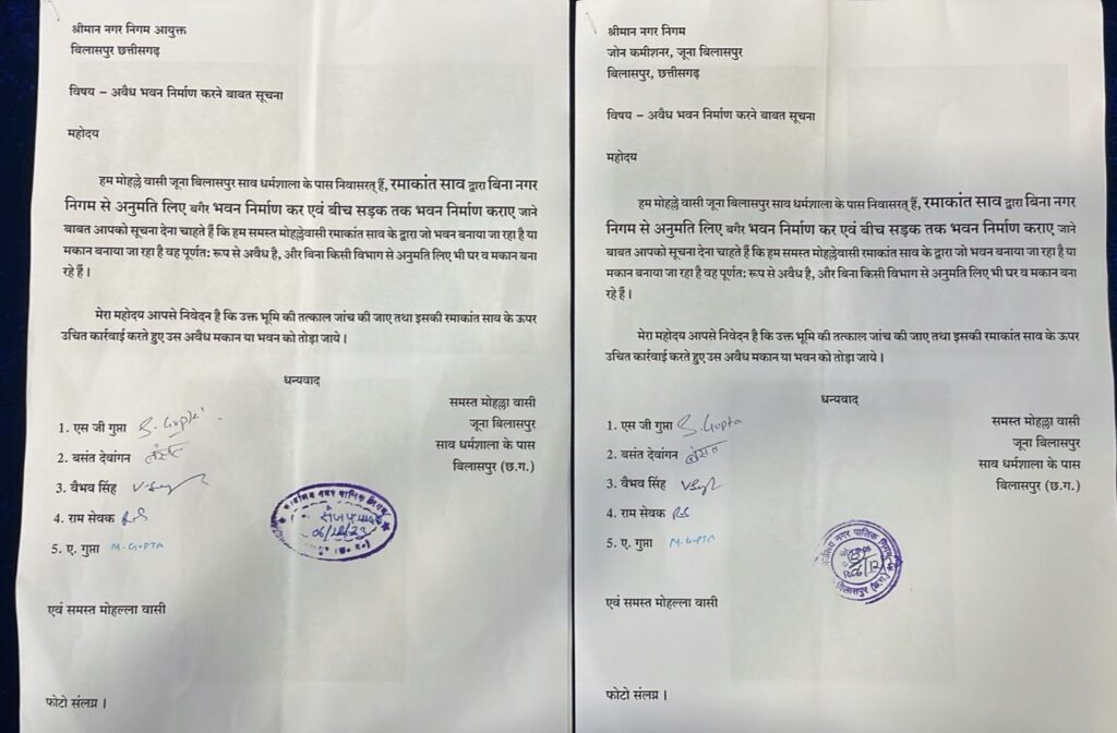 मोहल्ले वासियों द्वारा निगम आयुक्त से की गई शिकायत में कहा गया है की हम मोहल्ले वासी जूना बिलासपुर साव धर्मशाला के पास निवासरत हैं, रमाकांत साव द्वारा बिना नगर निगम से अनुमति लिए बगैर भवन निर्माण कर एवं बीच सड़क तक भवन निर्माण कराए जाने बाबत आपको सूचना देना चाहते हैं कि हम समस्त मोहल्लेवासी रमाकांत साव के द्वारा जो भवन बनाया जा रहा है या मकान बनाया जा रहा है वह पूर्णतः रूप से अवैध है, और बिना किसी विभाग से अनुमति लिए भी घर व मकान बना रहे हैं।