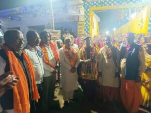 नवागांव जाते वक्त न्यू मित्र मिलन ढाबा मैं कार्यकर्ताओं से मुलाकात कर नवागांव पहुंचे संगीत मयभागवत कथा जिला महामंत्री मोहित जायसवाल के निवास स्थान पर