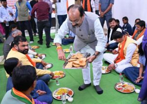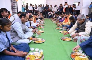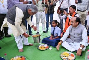 न्योता भोज में शामिल हुए उप मुख्यमंत्री साव और स्वास्थ्य मंत्री बच्चों को स्नेह से परोसा भोजन बच्चों के साथ जमीन पर बैठकर खाया खाना…