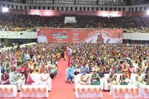 स्टेडियम में महिलाओं का जनसैलाब उमड़ पड़ा, ऊपर-नीचे सहित गलियारों में भी बैठकर महिलाओं ने प्रधानमंत्री नरेंद्र मोदी को सुना।