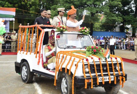 उपमुख्यमंत्री साव ने शांति के प्रतीक सफेद कबूतर उड़ाए और हर्षोल्लास और उमंग के प्रतीक तिरंगे गुब्बारे आकाश में छोड़े। पूरे परिधान में सजे हुए 12 प्लाटूनों ने भव्य एवं आकर्षक परेड का प्रदर्शन किया।
