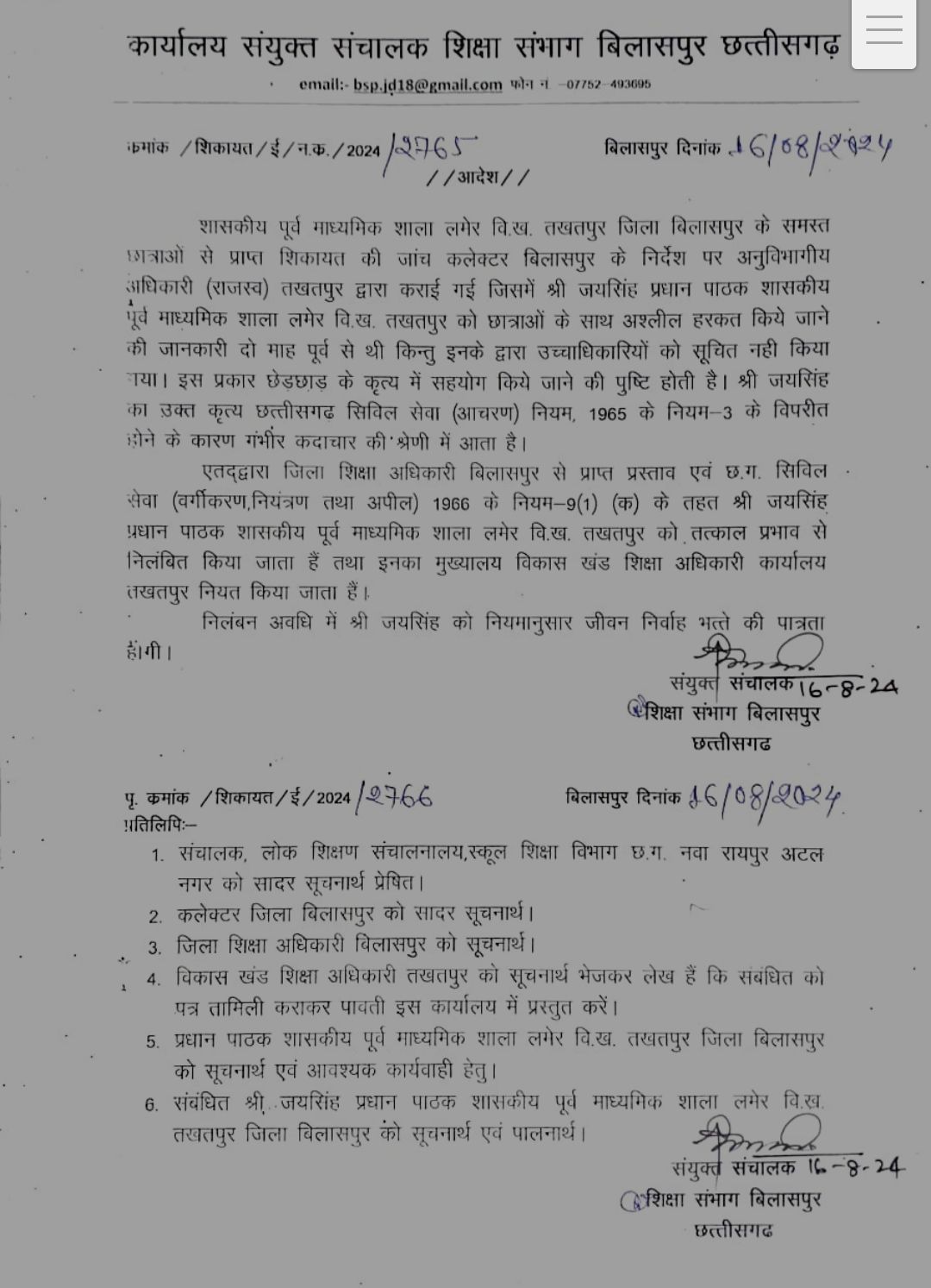 बिलासपुर-[जनहित न्यूज़] शासकीय पूर्व माध्यमिक शाला लमेर विकासखंड तखतपुर की छात्राओं ने कलेक्टर अवनीश शरण से शिकायत की थी कि विद्यालय में शिक्षक राम नारायण दुबे उनसे छेड़छाड़ करता है, कलेक्टर अवनीश शरण ने इसे गंभीरता से लिया और एसडीएम तखतपुर से इसकी जांच कराई गई। जांच में पाया गया कि रामनारायण दुबे शिक्षक के द्वारा इस प्रकार की घटना की गई है। इसकी सूचना दो माह पूर्व शाला के प्रधान पाठक जय सिंह को भी थी किंतु उन्होंने उच्च अधिकारियों को सूचित नहीं किया गया। दोनों के गंभीर कृत्य के कारण तत्काल प्रभाव से दोनों को निलंबित किया गया है। दोनों का मुख्यालय विकासखंड शिक्षा अधिकारी कार्यालय तखतपुर नियत किया गया है। संकुल समन्वयक प्रदीप कुमार माथुर के द्वारा इसकी सूचना उच्च अधिकारियों को नहीं दिए जाने के फल स्वरुप स्पष्टीकरण जारी किया गया है।