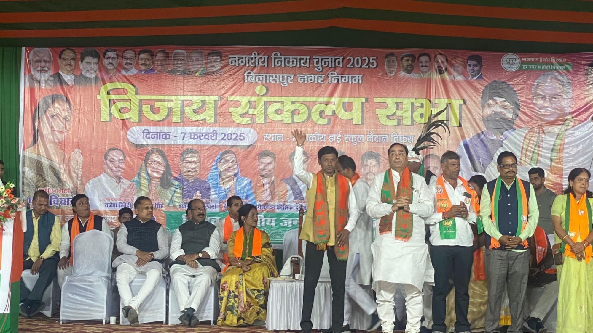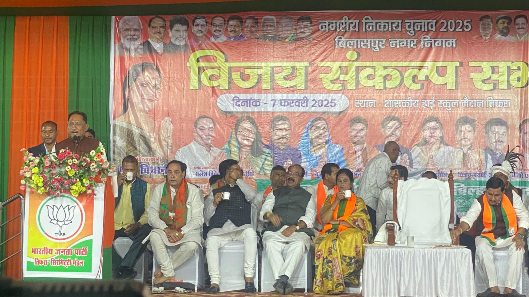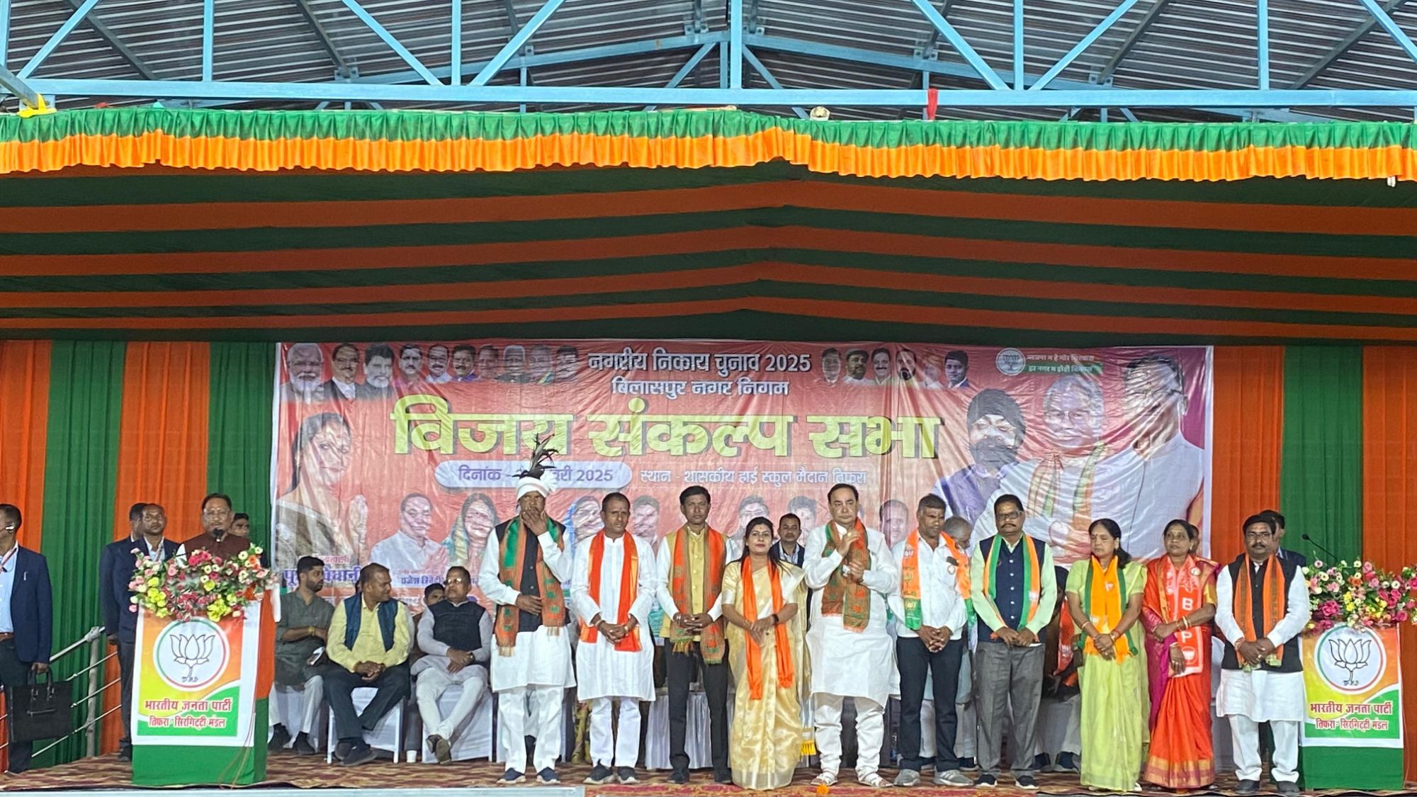 मंच पर केन्द्रीय राज्य मंत्री तोखन साहू, उपमुख्यमंत्री अरूण साव, बिलासपुर विधायक अमर अग्रवाल, महापौर प्रत्याशी पूजा विधानी, बिलासपुर ग्रामीण जिलाध्यक्ष मोहित जायसवाल, बिलासपुर शहर जिलाध्यक्ष दीपक सिंह ठाकुर, भाजपा पार्षद प्रत्याशी उपस्थित थे।