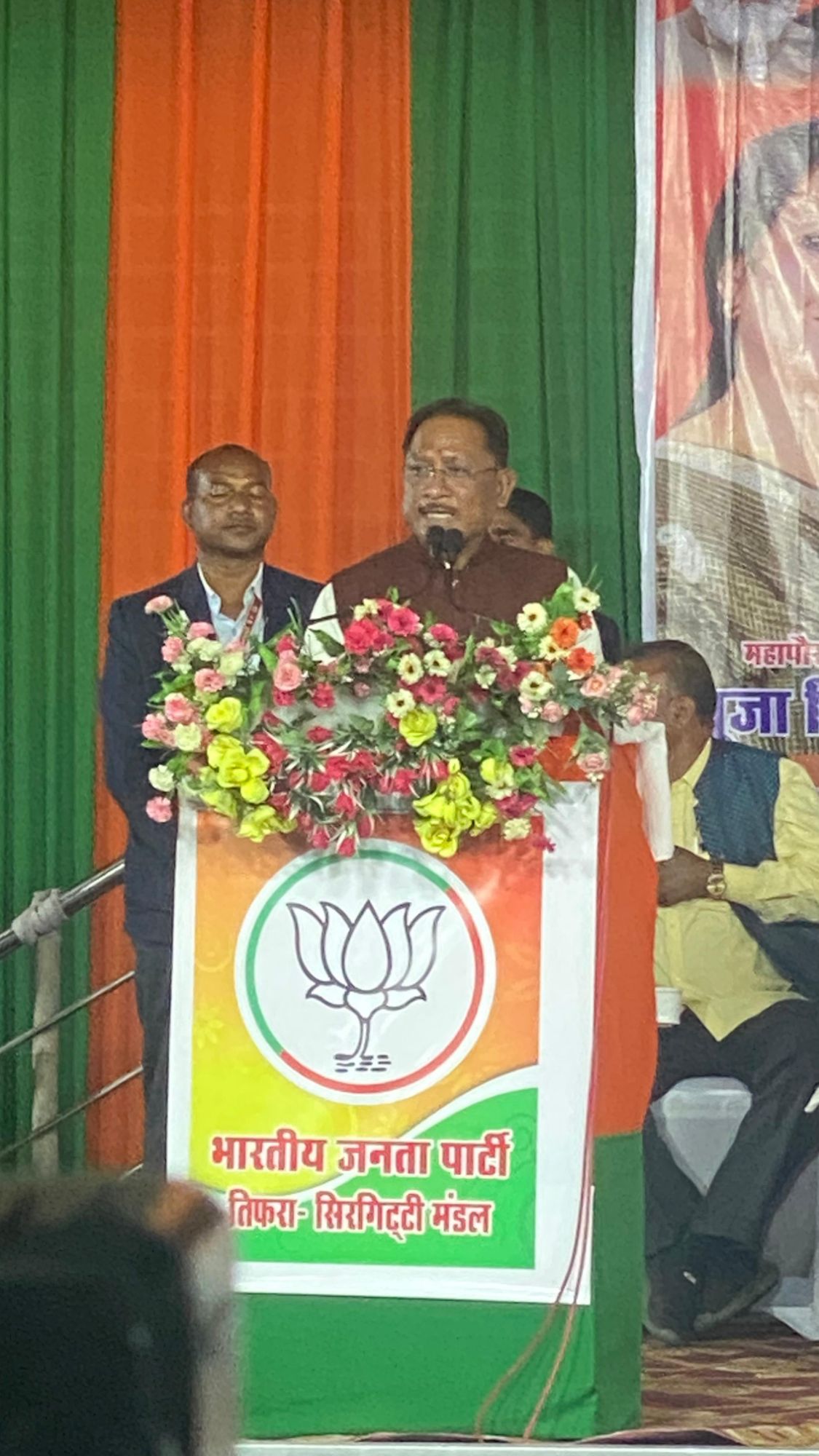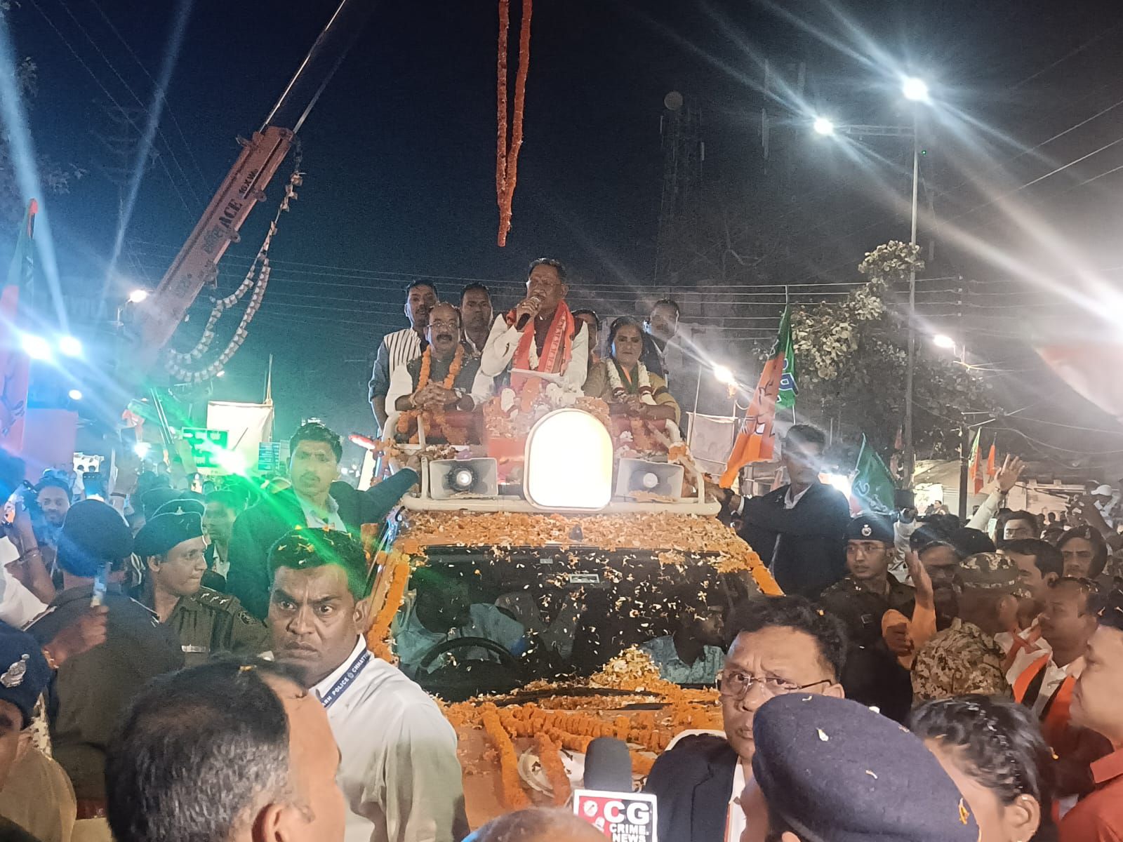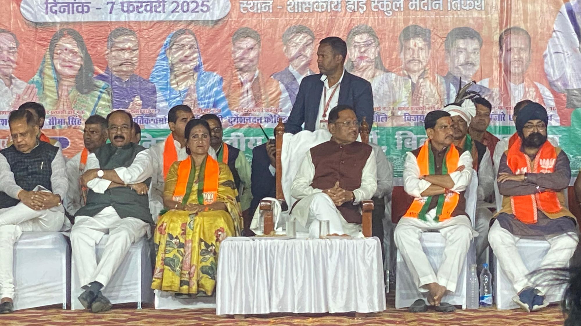 मंच पर केन्द्रीय राज्य मंत्री तोखन साहू, उपमुख्यमंत्री अरूण साव, बिलासपुर विधायक अमर अग्रवाल, महापौर प्रत्याशी पूजा विधानी, बिलासपुर ग्रामीण जिलाध्यक्ष मोहित जायसवाल, बिलासपुर शहर जिलाध्यक्ष दीपक सिंह ठाकुर, भाजपा पार्षद प्रत्याशी उपस्थित थे।