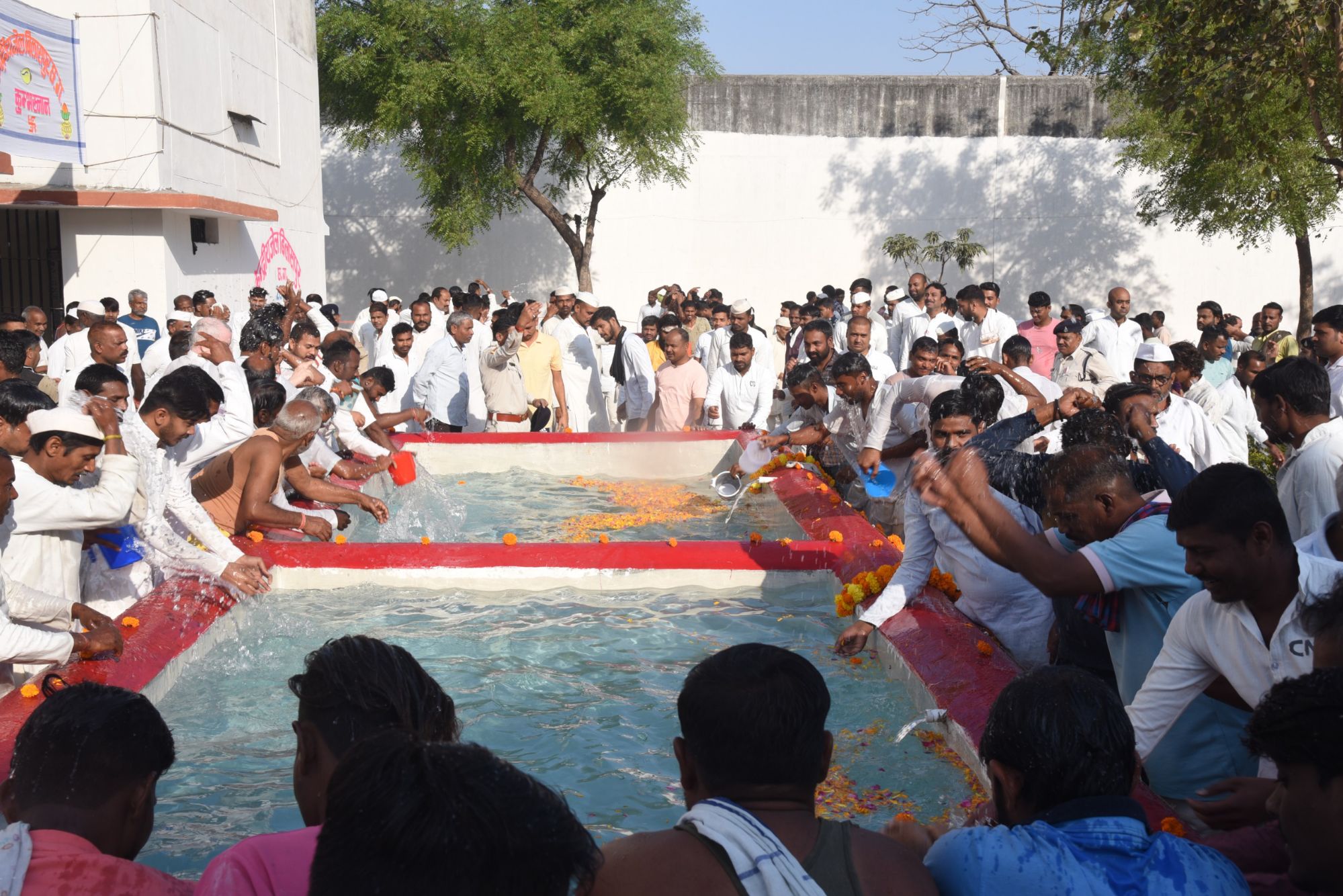 कैदियों की भजन मण्डली ने जेल के मुख्य द्वार से गंगा जल को सुन्दरता से सजायी गई मटकियों में रख कर टंकियों और अन्य कैदियों तक पहुंचाया।