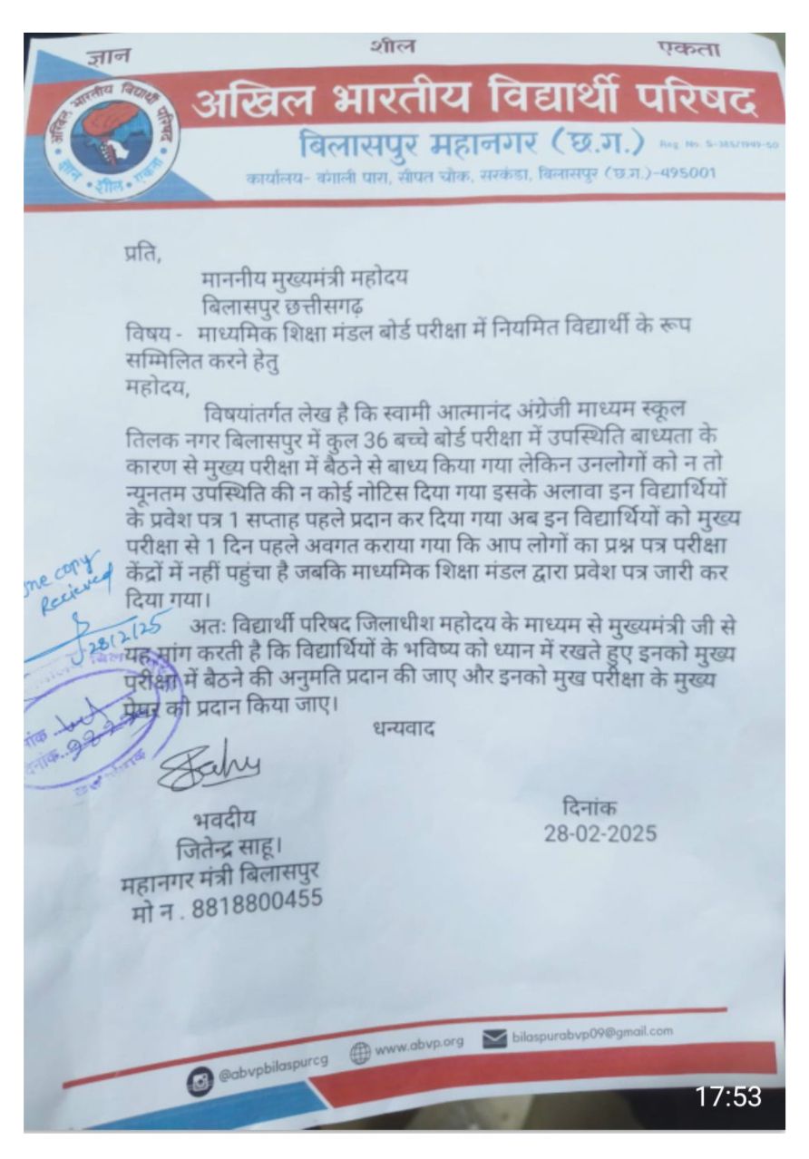 बिलासपुर- (जनहित न्यूज़) – 10वीं और 12वीं बोर्ड परीक्षा से ठीक एक दिन पहले स्वामी आत्मानंद तिलकनगर स्कूल के 36 छात्रों को शॉर्ट अटेंडेंस के नाम पर परीक्षा से वंचित करने के आदेश से हड़कंप मच गया। देर रात अचानक आए इस फरमान के खिलाफ छात्रों और उनके अभिभावकों ने अखिल भारतीय विद्यार्थी परिषद (ABVP) के नेतृत्व में जबरदस्त प्रदर्शन किया। विरोध इतना तेज हुआ कि एबीवीपी को अपनी ही सरकार के खिलाफ नारेबाजी करनी पड़ी!