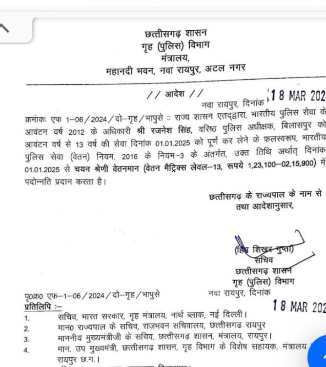बिलासपुर-{जनहित न्यूज़} छत्तीसगढ़ सरकार ने भारतीय पुलिस सेवा (IPS) के तेजतर्रार और कर्तव्यनिष्ठ अधिकारी रजनेश सिंह को वरिष्ठ पुलिस अधीक्षक (SSP) के पद पर पदोन्नत कर दिया है। 01 जनवरी 2025 से यह पदोन्नति प्रभावी मानी जाएगी। अपराध नियंत्रण से लेकर नक्सल मोर्चे और आतंकवाद विरोधी अभियानों तक उनके नेतृत्व में कई बड़े ऑपरेशन सफल हुए हैं।