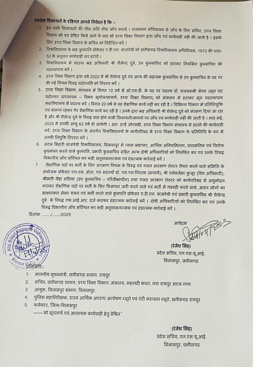 एनएसयूआई ने विश्वविद्यालय में स्थायी कुलसचिव की नियुक्ति के लिए शासन को तत्काल पत्र लिखने की मांग की है, जिससे प्रशासनिक पारदर्शिता सुनिश्चित की जा सके।