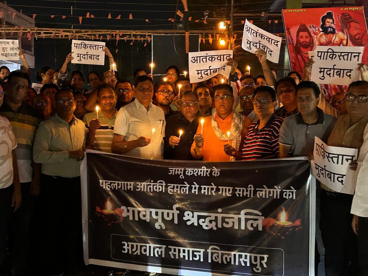 इसी कड़ी में बिलासपुर अग्रवाल समाज द्वारा शुक्रवार शाम 6:30 बजे आतंकी हमले के विरोध में एक मौन कैंडल मार्च का आयोजन किया गया। यह श्रद्धांजलि यात्रा पुराना बस स्टैंड से प्रारंभ होकर शहीद स्मारक CMD चौक तक पहुँची। समाज के सैकड़ों बंधुओं ने कैंडल जलाकर निर्दोष शहीदों को अपनी मौन श्रद्धांजलि अर्पित की।