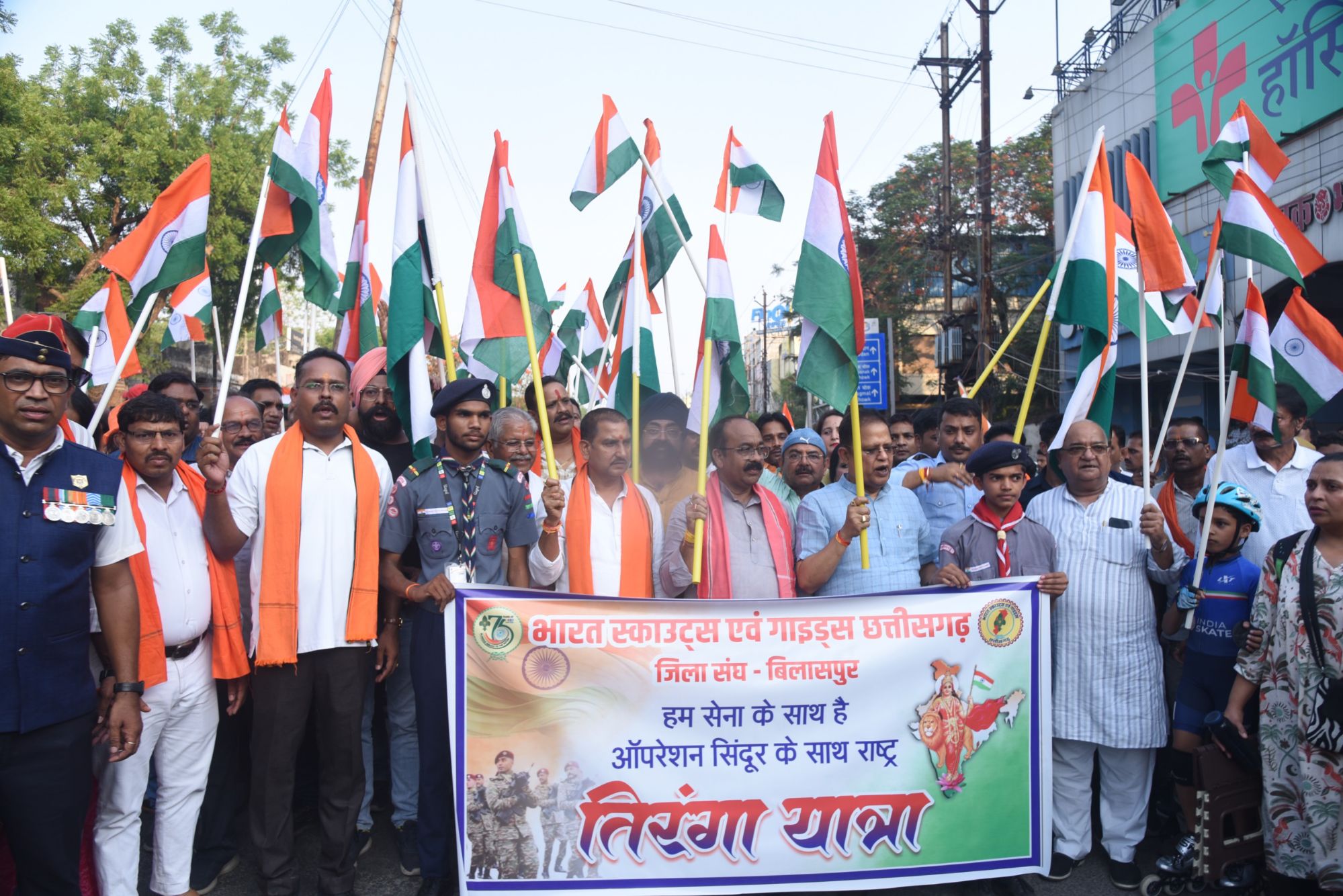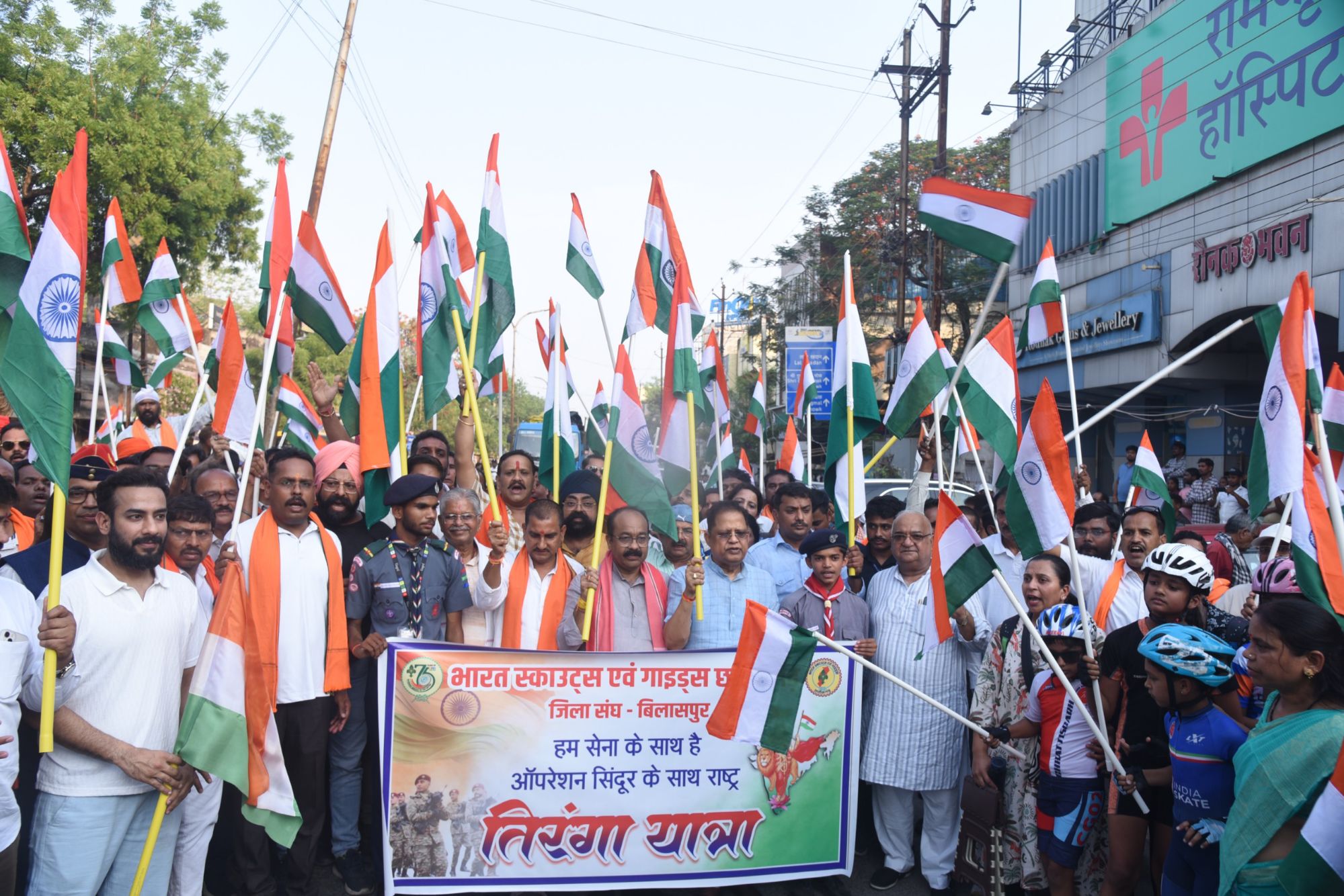 बिलासपुर-{जनहित न्यूज़}बिलासपुर जिले में “ऑपरेशन सिंदूर” अभियान के अंतर्गत देशभक्ति से ओत-प्रोत तिरंगा यात्रा का भव्य आयोजन किया गया। जिला स्तरीय यात्रा को केंद्रीय आवासन एवं शहरी विकास राज्य मंत्री तोखन साहू और उप मुख्यमंत्री अरुण साव ने हरी झंडी दिखाकर रवाना किया। इस अवसर पर विधायक अमर अग्रवाल, धरमजीत सिंह, धरम लाल कौशिक, सुशांत शुक्ला, महापौर श्रीमती पूजा विधानी, जिला पंचायत अध्यक्ष राजेश सूर्यवंशी, कमिश्नर सुनील जैन, कलेक्टर संजय अग्रवाल , एसएसपी रजनेश सिंह सहित जनप्रतिनिधि, पंचायत एवं नगरीय निकायों के प्रतिनिधि, अधिकारी, आम नागरिक, बच्चे एवं जवान बड़ी संख्या में शामिल हुए और देश के प्रति अपनी एकजुटता एवं सम्मान प्रकट किया।