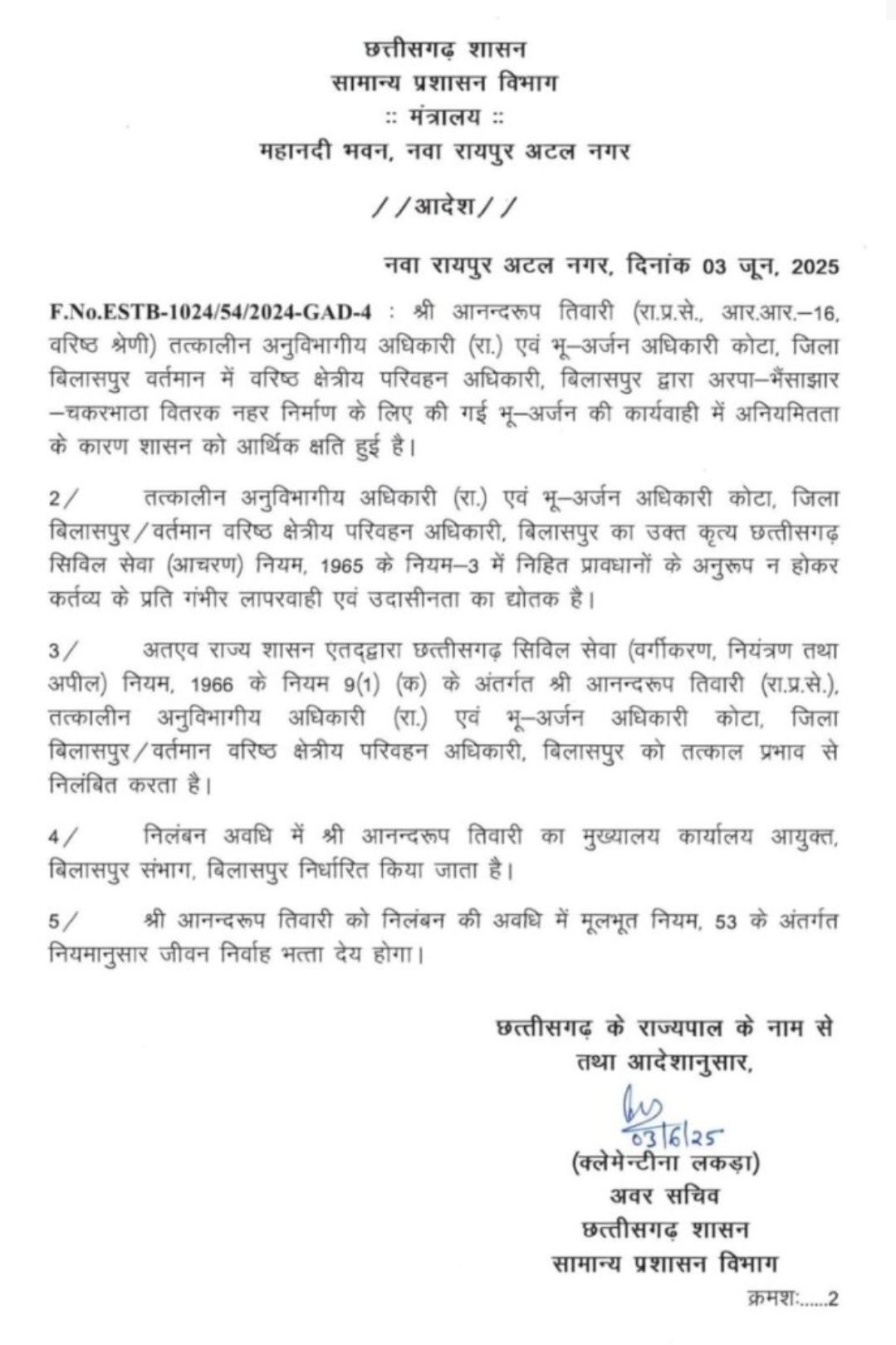 बिलासपुर {जनहित न्यूज} अरपा-भैंसाझार नहर परियोजना में करोड़ों के मुआवजा घोटाले में बड़ा खुलासा हुआ है। तत्कालीन कोटा एसडीएम और भू-अर्जन अधिकारी रहे आनंद स्वरूप तिवारी पर मुआवजा वितरण में भारी अनियमितता और शासन को आर्थिक क्षति पहुंचाने के गंभीर आरोप साबित होने पर उन्हें तत्काल प्रभाव से निलंबित कर दिया गया है। वर्तमान में बिलासपुर में आरटीओ पद पर पदस्थ तिवारी पर लंबे समय से गड़बड़ी के आरोप लग रहे थे, लेकिन अब शासन ने सख्ती दिखाते हुए कार्रवाई की है।