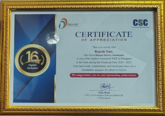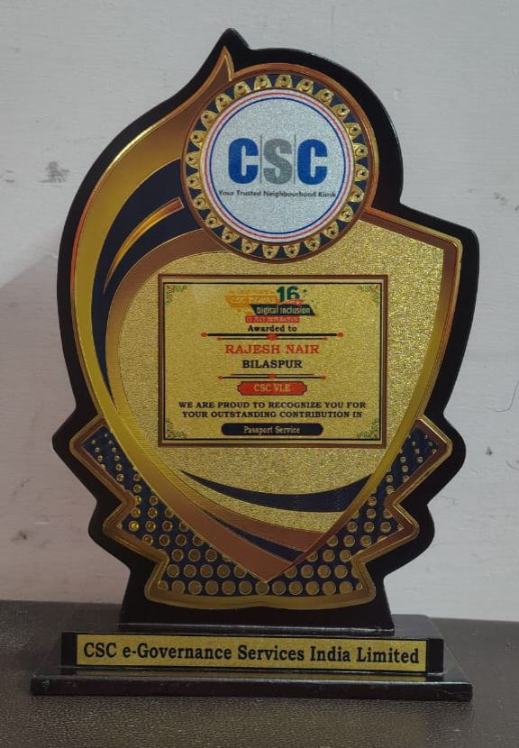 बिलासपुर से राजेश नायर को पासपोर्ट सेवा में पूरे छत्तीसगढ़ में सबसे अधिक आवेदन दर्ज करने के लिए विशेष रूप से सम्मानित किया गया। उनके इस उत्कृष्ट योगदान के लिए डिप्टी सीएम ने उन्हें मोमेंटो एवं प्रशस्ति पत्र प्रदान किया।