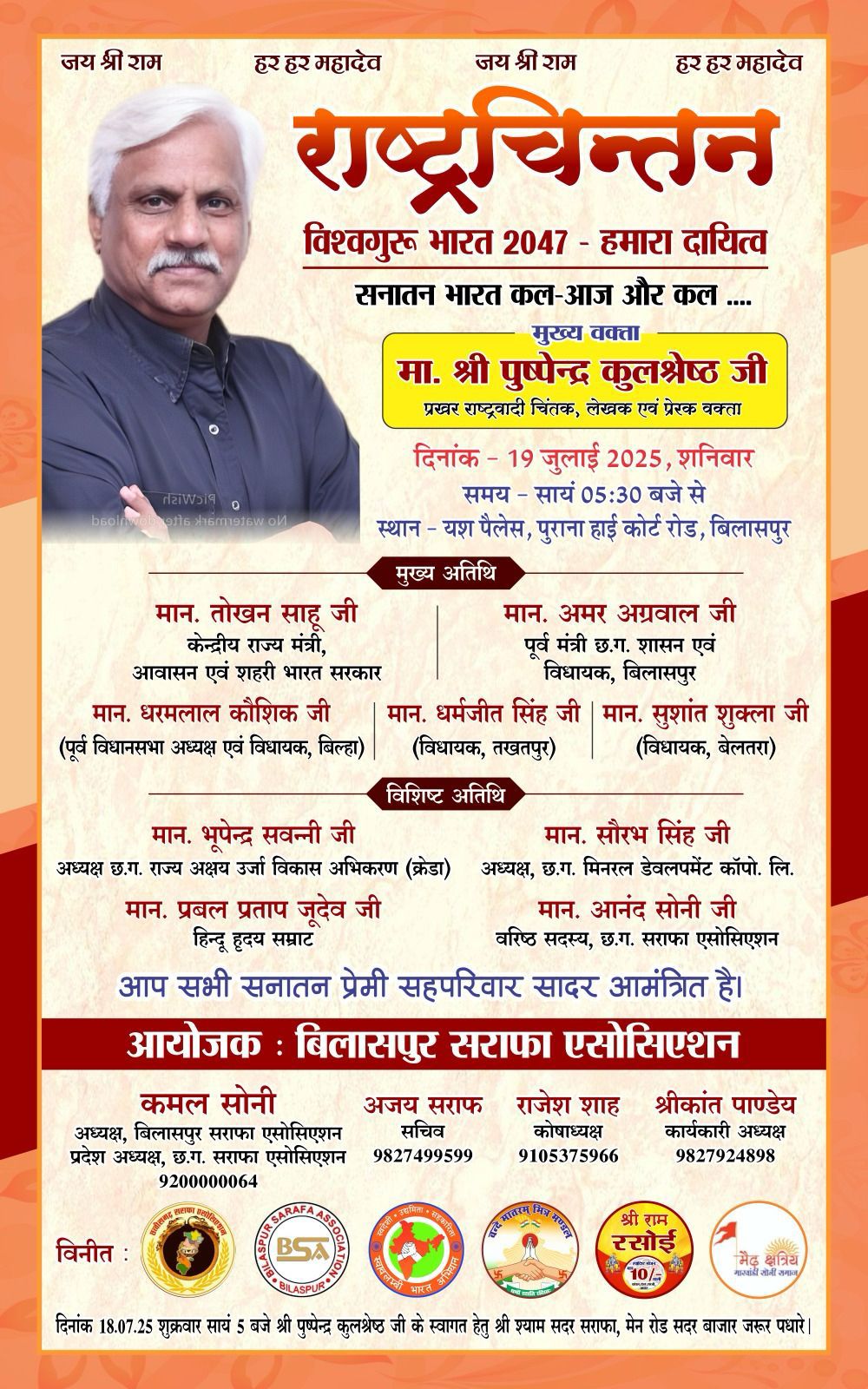 बिलासपुर-[जनहित न्यूज़] बिलासपुर सराफा एसोसिएशन के तत्वावधान में आगामी 19 जुलाई 2025 (शनिवार) को “राष्ट्रचिंतन (विश्वगुरु भारत 2047 – हमारा दायित्व)” विषयक एक भव्य कार्यक्रम का आयोजन किया जा रहा है। इस महत्वपूर्ण आयोजन में देश के प्रख्यात राष्ट्रवादी चिंतक व वक्ता पुष्पेन्द्र कुलश्रेष्ठ मुख्य अतिथि के रूप में शामिल होंगे। कार्यक्रम को ऐतिहासिक और अविस्मरणीय बनाने की तैयारियाँ ज़ोर-शोर से जारी हैं।