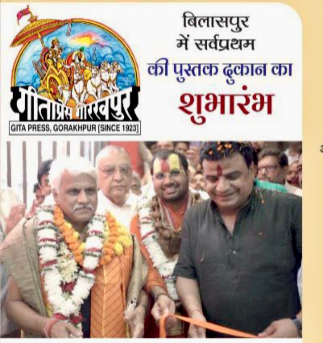सी-26 श्री श्याम सदर सराफा मेन रोड सदर बाजार बिलासपुर में गीता प्रेस गोरखपुर की पुस्तक दुकान का शुभारंभ शुक्रवार को राष्ट्र चिंतक पुष्पेन्द्र कुलश्रेष्ठ व नगर विधायक अमर अग्रवाल के मुख्य आतिथ्य, जय श्री श्याम मंदिर ट्रस्ट बिलासपुर के अध्यक्ष मंगतराय अग्रवाल के विशिष्ट आतिथ्य एवं भगवताचार्य पं. दुर्गेश अमसेना की उपस्थिति में किया गया।