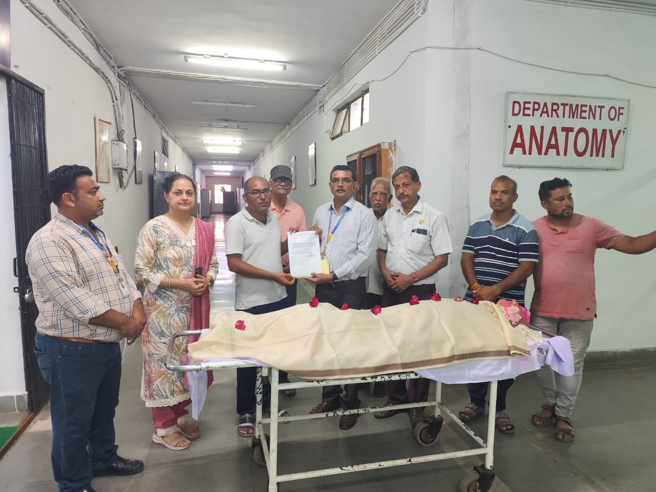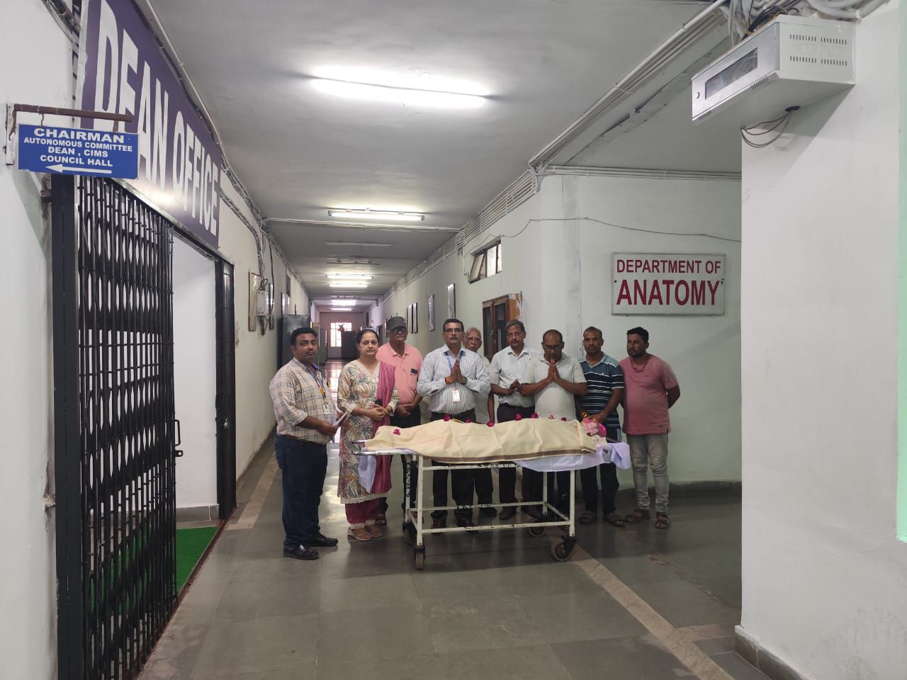 परिवारजनों सुधीर गुप्ता, शिशिर गुप्ता एवं हेमंत गुप्ता (बसंत साड़ी सेंटर, सदर बाजार) ने स्व. श्री गुप्ता की अंतिम इच्छा से सिम्स अस्पताल के अधिष्ठाता डॉ. रमणेश मूर्ति को अवगत कराया। तत्पश्चात एनाटॉमी विभाग प्रभारी डॉ. अमित श्रीवास्तव के नेतृत्व में आवश्यक दस्तावेजी प्रक्रिया पूर्ण कर यह पुण्य कार्य विधिवत संपन्न किया गया।