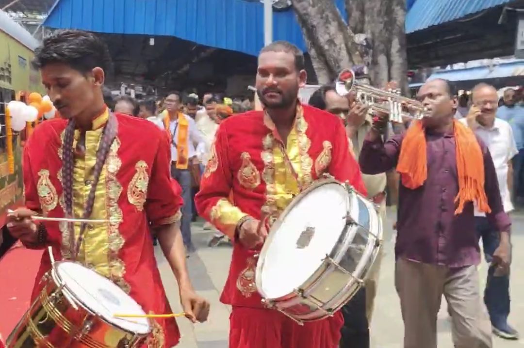 गाजे बाजे और पारंपरिक नृत्य और तिलक लगाकर भक्तों का स्वागत किया गया।