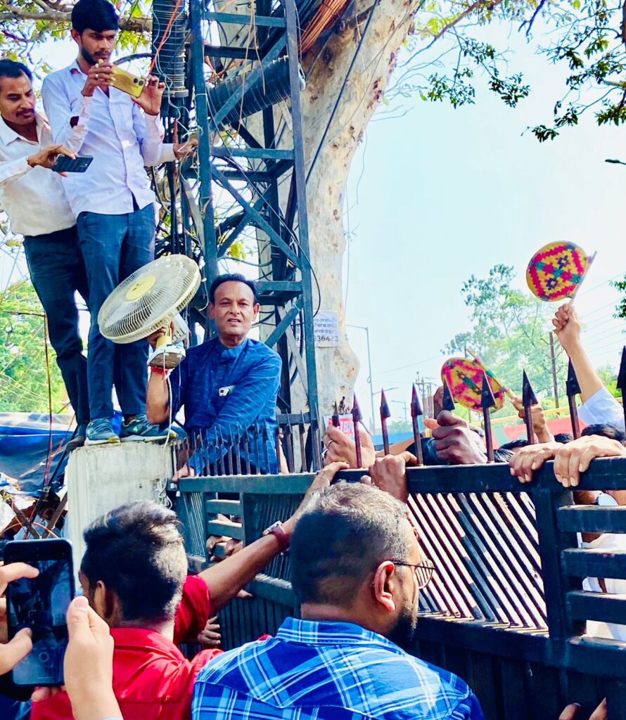 हाथों में झुलने वाले पंखे और टेबल फैन लिए कार्यकर्ताओं ने जमकर नारेबाजी की