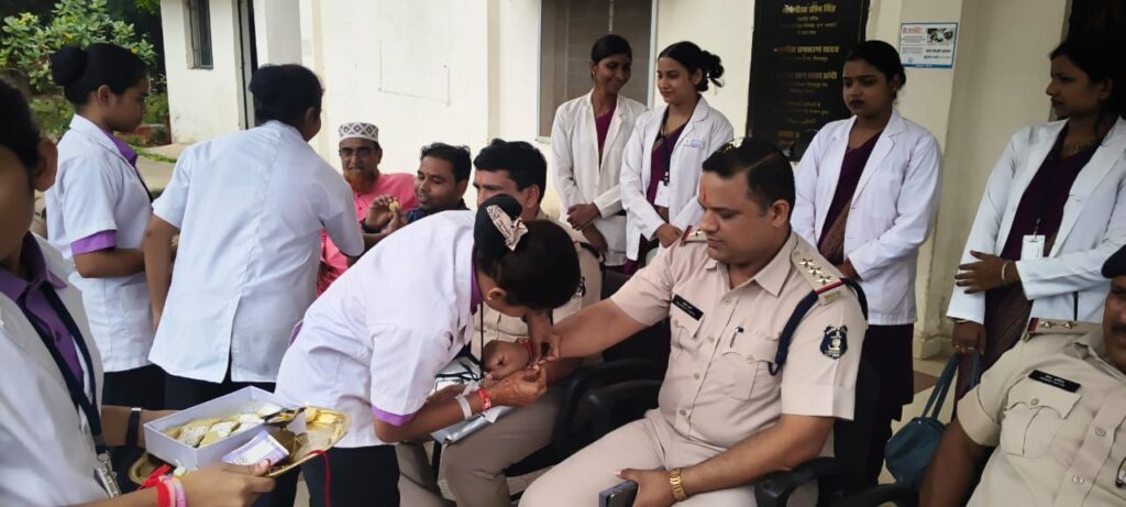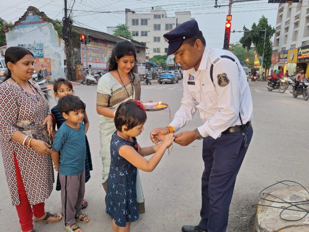 रक्षाबंधन पर्व के दौरान ट्रैफिक व्यवस्था और कानून-व्यवस्था संभाल रहे जवानों को भी महिला बच्चों ने चौक-चौराहों पर जाकर राखी बांधी।