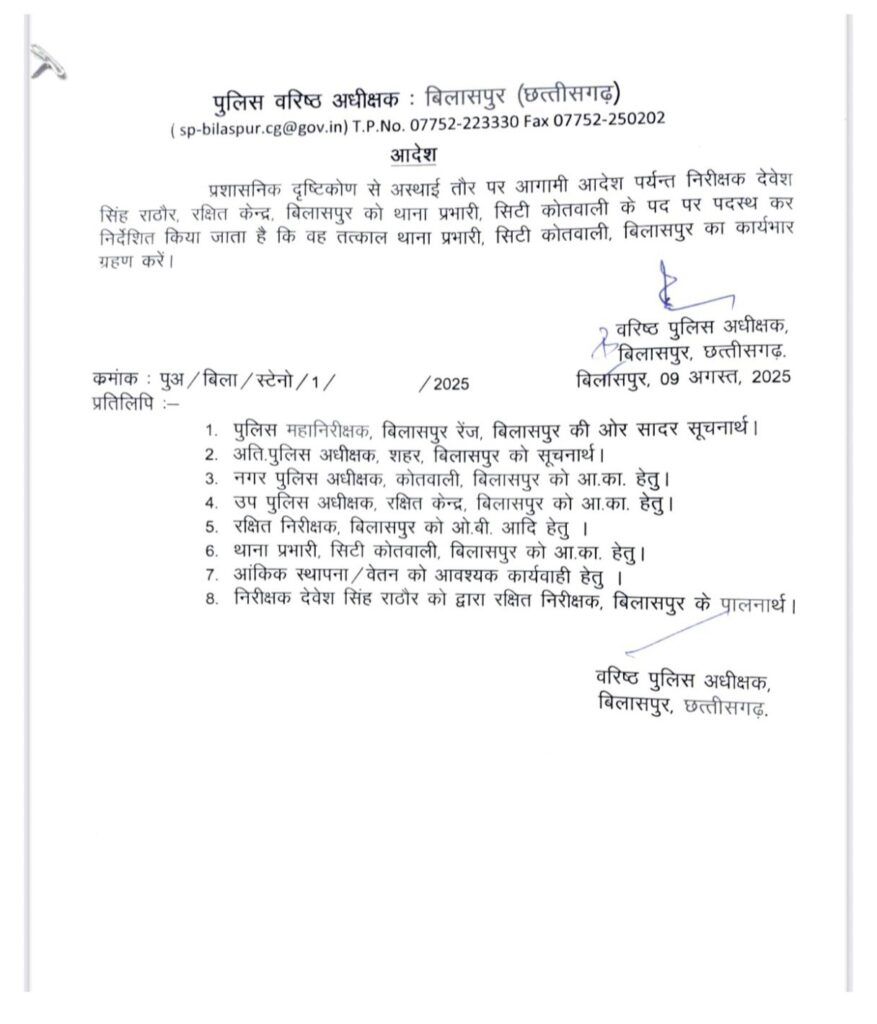 बिलासपुर-{जनहित न्यूज़}बिलासपुर वरिष्ठ पुलिस अधीक्षक के सख्त निर्देशों के तहत थाना प्रभारी निरीक्षक विवेक पांडेय को तत्काल प्रभाव से लाइन अटैच कर दिया गया है। यह कार्रवाई उनके अधीनस्थ स्टाफ पर नियंत्रण रखने में विफलता और कर्तव्य में लापरवाही के गंभीर आरोपों के चलते हुई है।