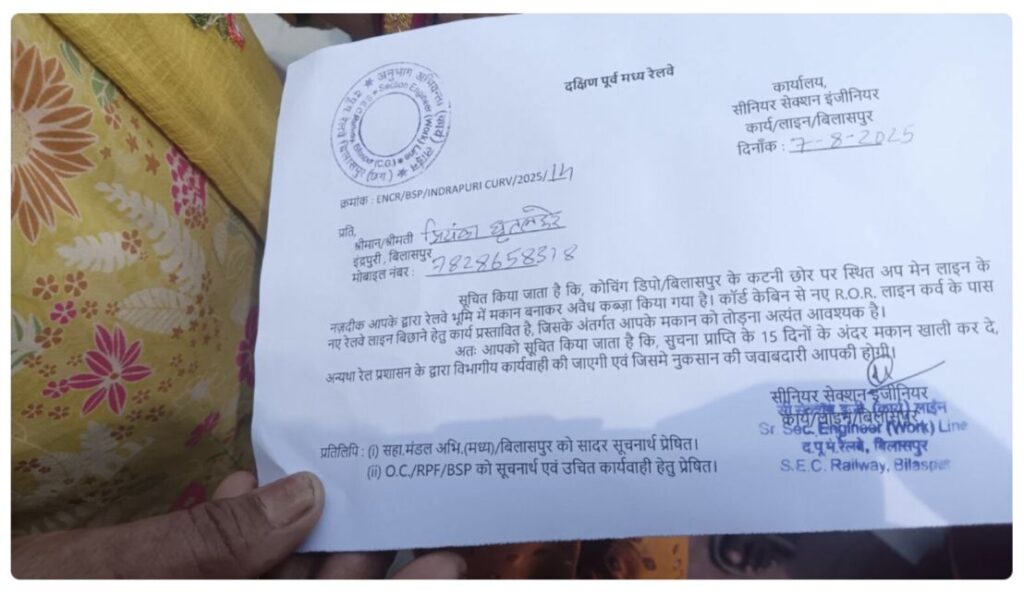 बिलासपुर-[जनहित न्यूज]बरसाती बादलों के बीच इंद्रपुरी की गलियों में डर का साया मंडरा रहा है। रेलवे ने जमीन खाली करने का आदेश थमा दिया है, जिससे वर्षों से झोपड़ियों में गुजर-बसर करने वाले सैकड़ों परिवारों पर बेघर होने की तलवार लटक गई है। लाइन विस्तार के नाम पर आया यह नोटिस उनके सिर से छत छीनने का ऐलान जैसा है।