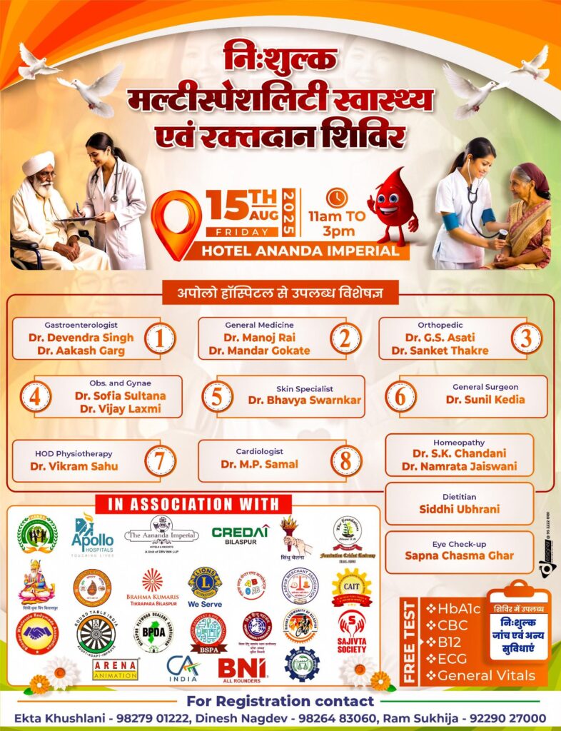 हैंड्सग्रुप के संरक्षक अभिषेक विधानी ने बताया कि इस बार अपोलो हॉस्पिटल बिलासपुर के विशेषज्ञ चिकित्सक अपनी सेवाएँ निःशुल्क देंगे और साथ ही अपोलो द्वारा विटामिन B12, HbA1c, CBC, ECG और जनरल वाइटल्स जैसी जांच भी निःशुल्क उपलब्ध कराई जाएगी।