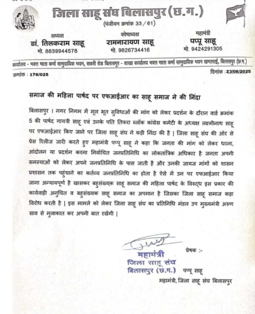 बिलासपुर-{जनहित न्यूज़}बिलासपुर नगर निगम क्षेत्र की बदहाल व्यवस्था के खिलाफ प्रदर्शन करना वार्ड क्रमांक-5 की पार्षद गायत्री साहू और उनके पति तिफरा ब्लॉक कांग्रेस कमेटी अध्यक्ष लक्ष्मीनाथ साहू को भारी पड़ गया। पुलिस ने दोनों पर एफआईआर दर्ज कर दी। इस कार्रवाई ने पूरे साहू समाज को झकझोर दिया है। जिला साहू संघ ने इसे लोकतांत्रिक अधिकारों पर कुठाराघात बताते हुए तीखी आपत्ति दर्ज की है।