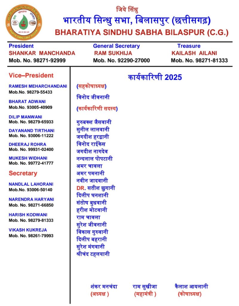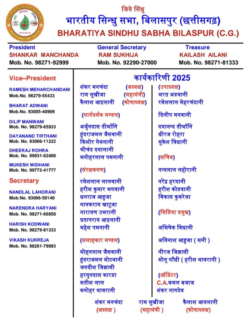 अध्यक्ष शंकर मनचंदा द्वारा वर्ष 2025-27 तक के लिए नई कार्यकारिणी का गठन किया गया एवं आगामी माह मे सिंधी समाज के प्रतिभा शाली बच्चों का सम्मान करने के लिए 7 सितम्बर 2025 रविवार को झूलेलाल मंगलम, तिफरा बिलासपुर मे प्रतिभा सम्मान समारोह की तैयारियो की उपस्थित सदस्यों को जानकारी दी गई व सभी को कार्यक्रम की जिम्मेदारी दी गई व कार्यक्रम को सफल बनाने के लिए सभी से सहयोग माँगा गया जिसपर सभी सदस्यों के द्वारा अपनी सहमति दी गई।