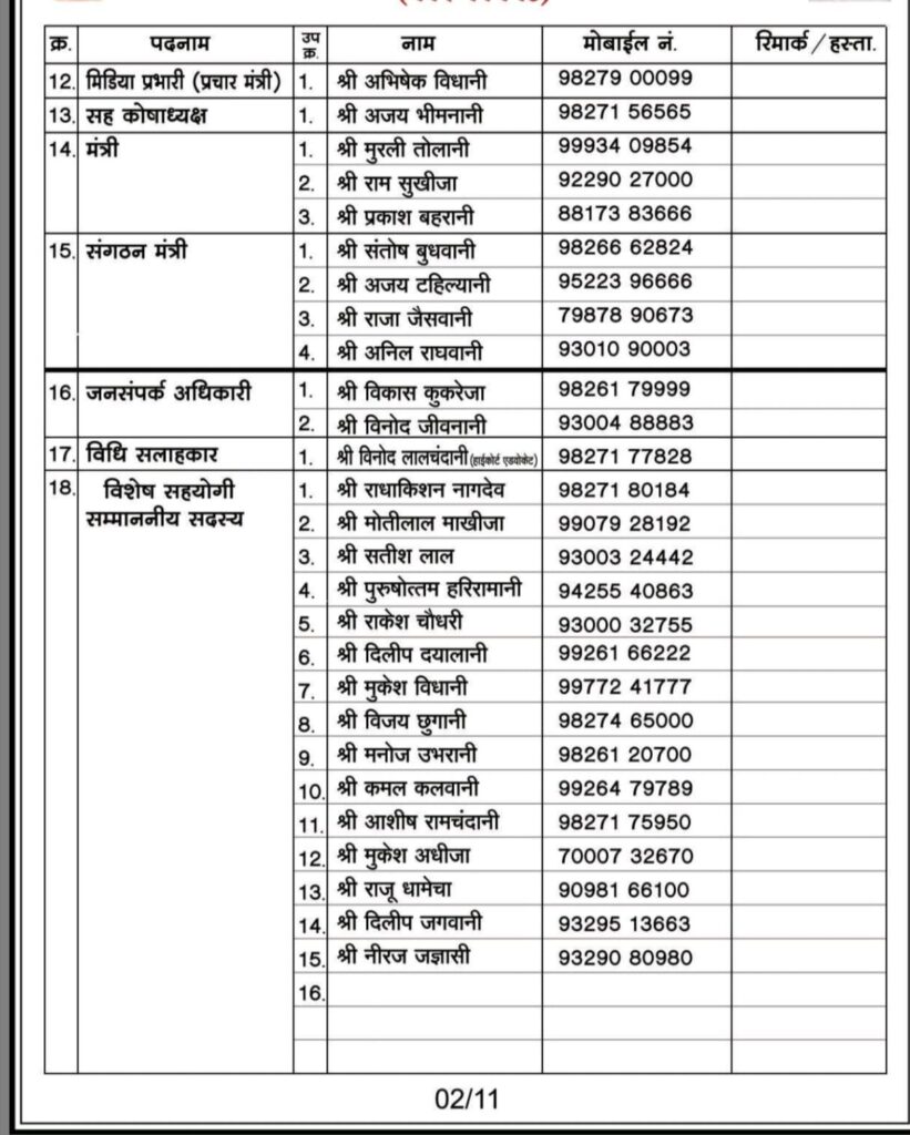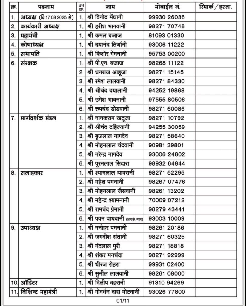 विनोद मेंघानी को अध्यक्ष, कमल बजाज को महामंत्री और दयानंद तीर्थानी को कोषाध्यक्ष की सौंपी गई जिम्मेदारी…
