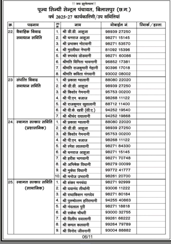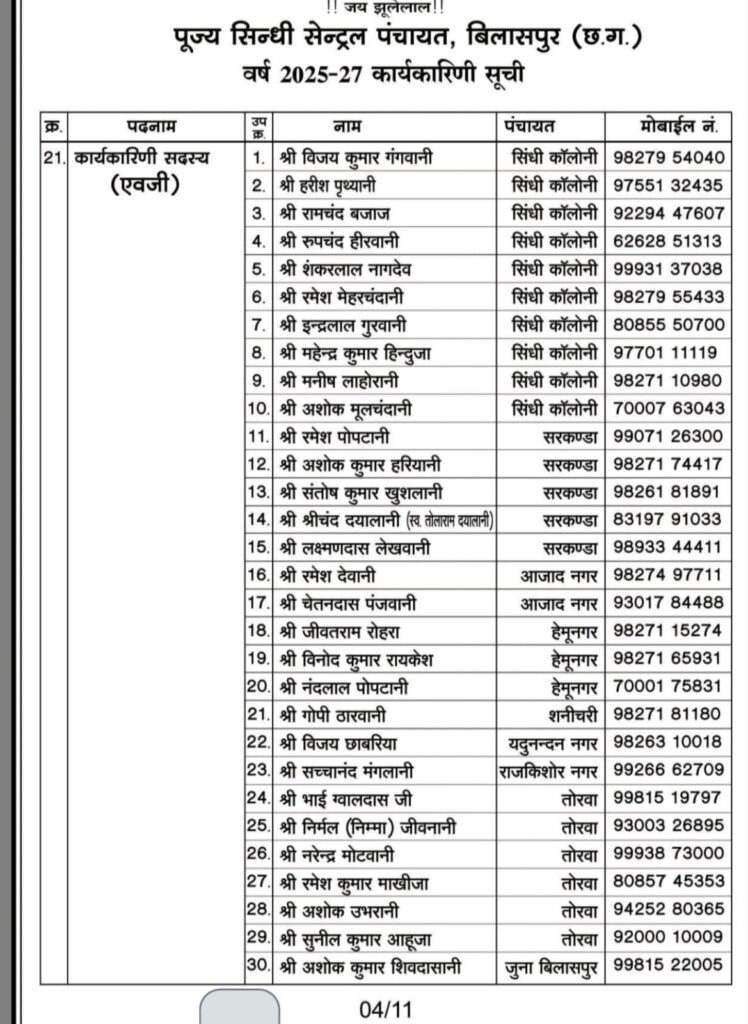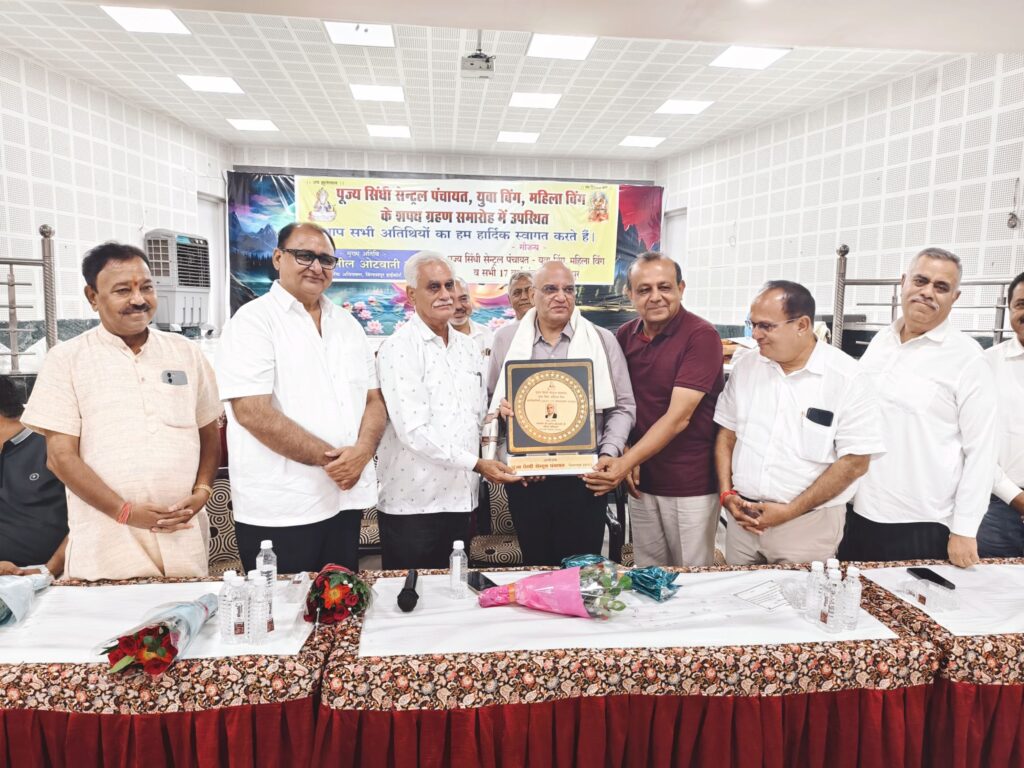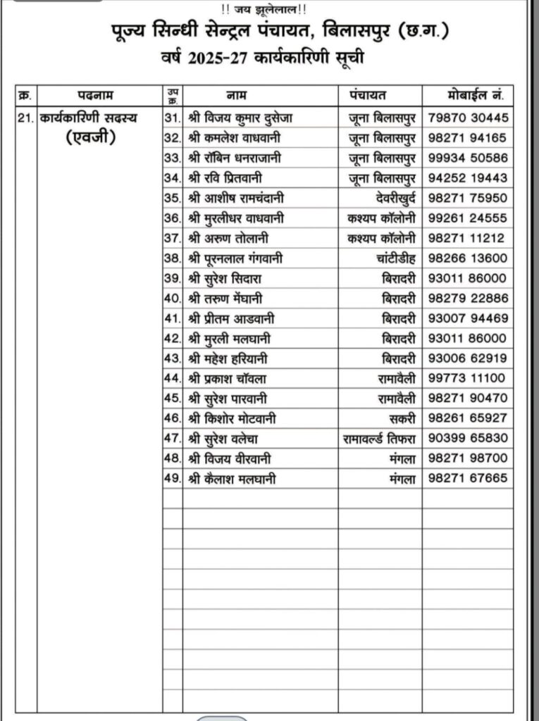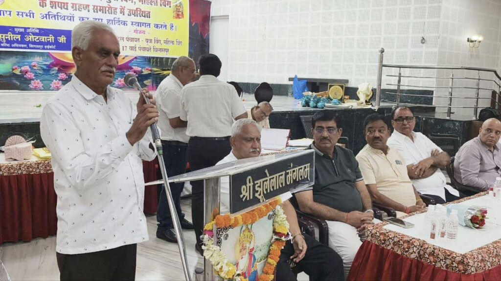बिलासपुर-{जनहित न्यूज़} पूज्य सिंधी सेंट्रल पंचायत बिलासपुर की नई कार्यकारिणी का गठन किया गया। शनिवार को झूलेलाल मंगलम में आयोजित गरिमामय शपथ समारोह में विनोद मेंघानी को अध्यक्ष, कमल बजाज को महामंत्री और दयानंद तीर्थानी को कोषाध्यक्ष की जिम्मेदारी सौंपी गई।