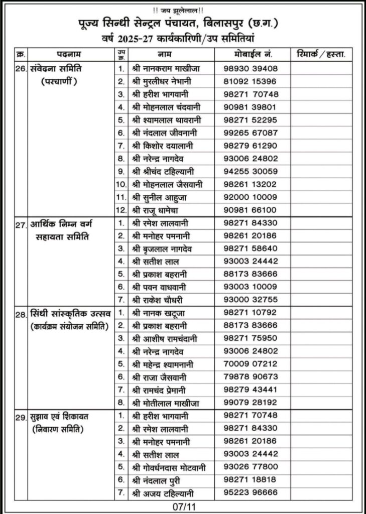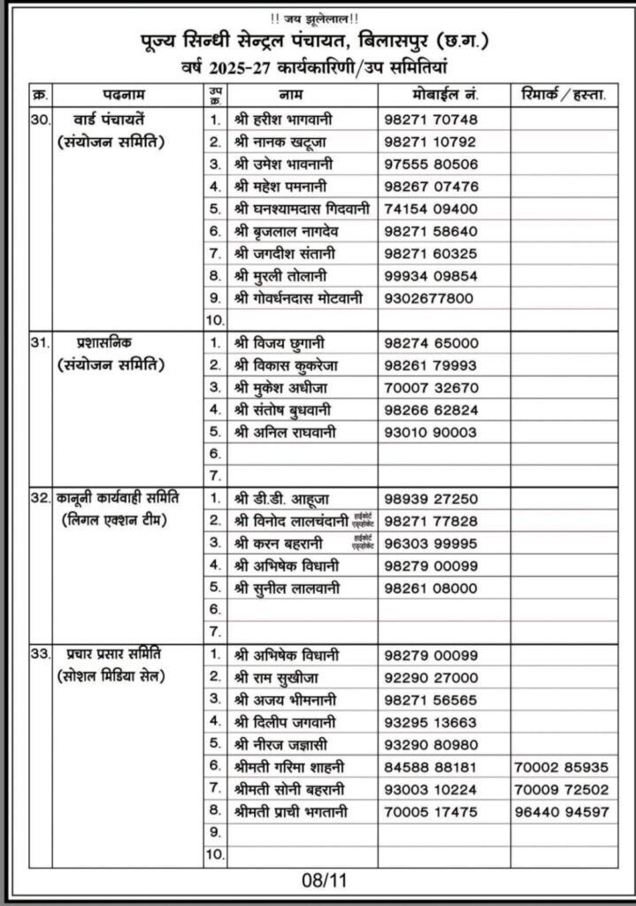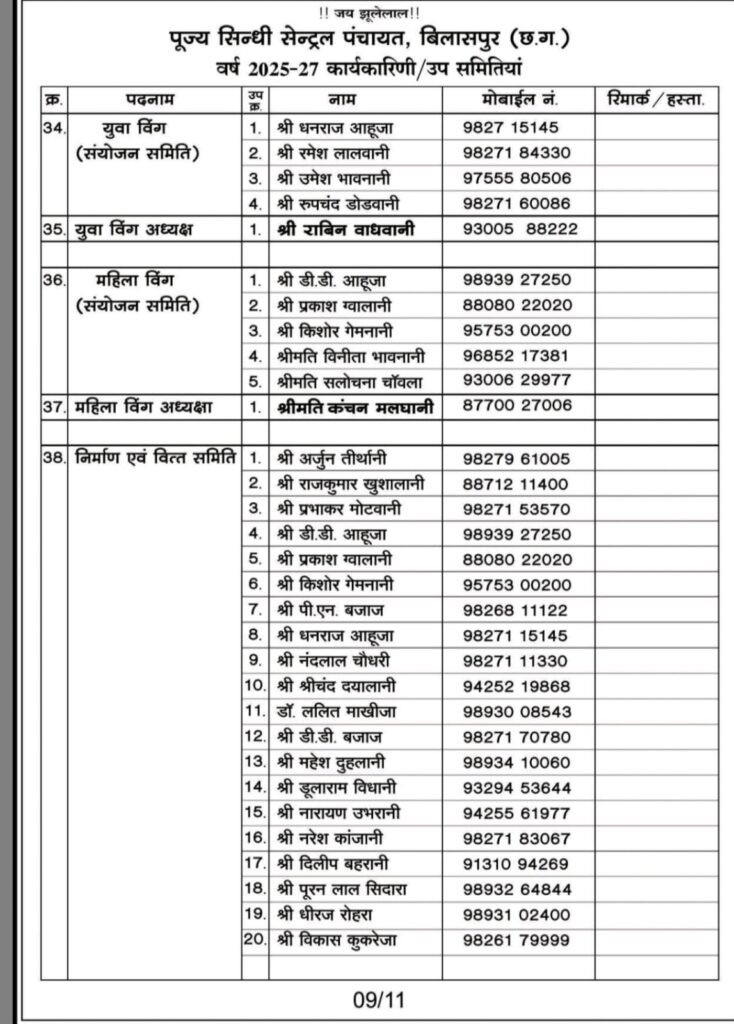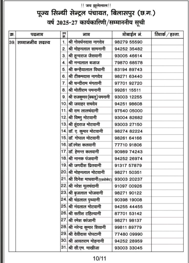 बिलासपुर-{जनहित न्यूज़} पूज्य सिंधी सेंट्रल पंचायत बिलासपुर की नई कार्यकारिणी का गठन किया गया। शनिवार को झूलेलाल मंगलम में आयोजित गरिमामय शपथ समारोह में विनोद मेंघानी को अध्यक्ष, कमल बजाज को महामंत्री और दयानंद तीर्थानी को कोषाध्यक्ष की जिम्मेदारी सौंपी गई।