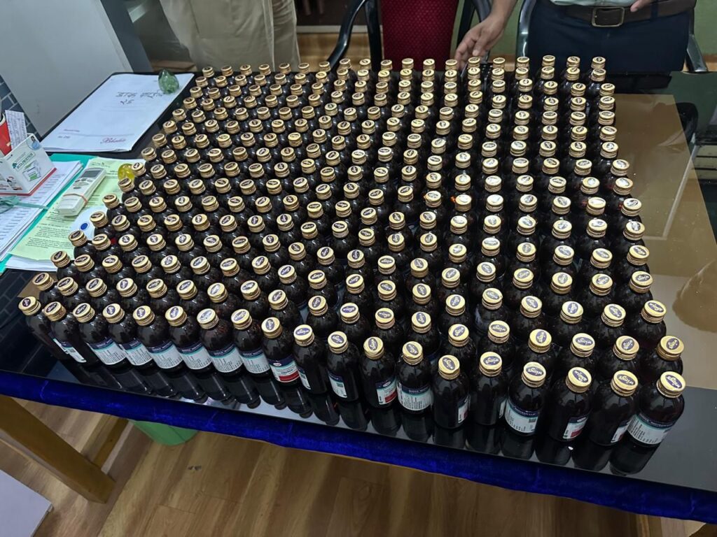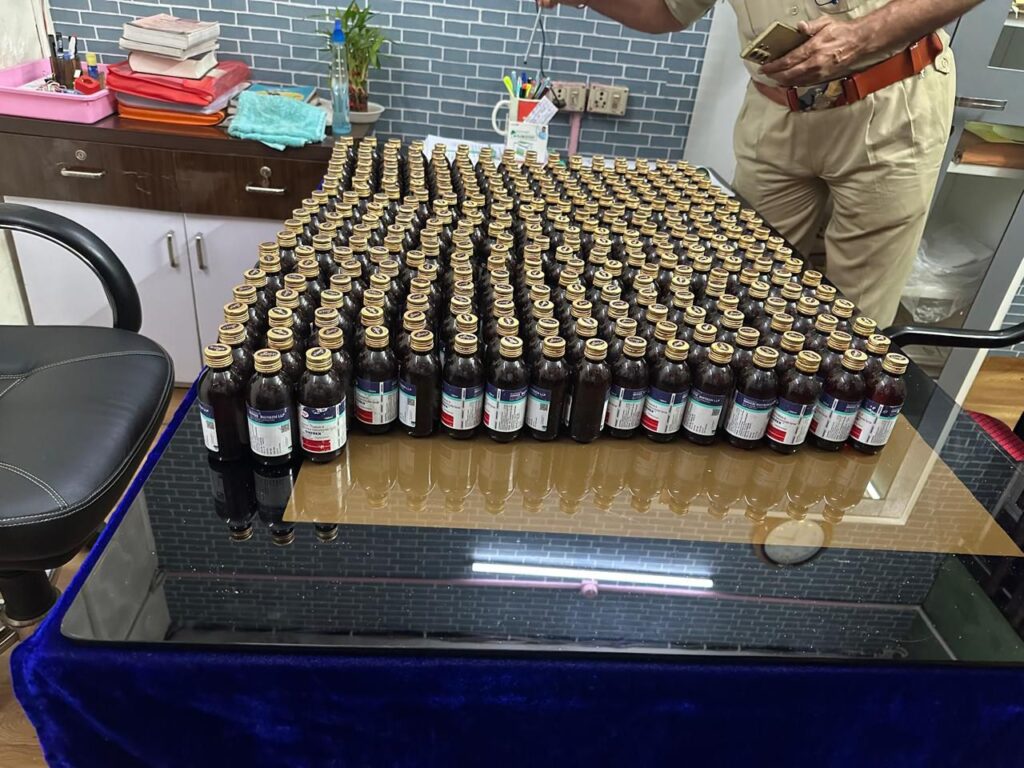 आरोपियों के पास से 320 नग प्रतिबंधित Codeine Phosphate & Triprolidine Hydrochloride ONEREX Cough Syrup, एक मोटरसाइकिल और 04 एंड्रॉइड मोबाइल फोन जब्त किए गए।