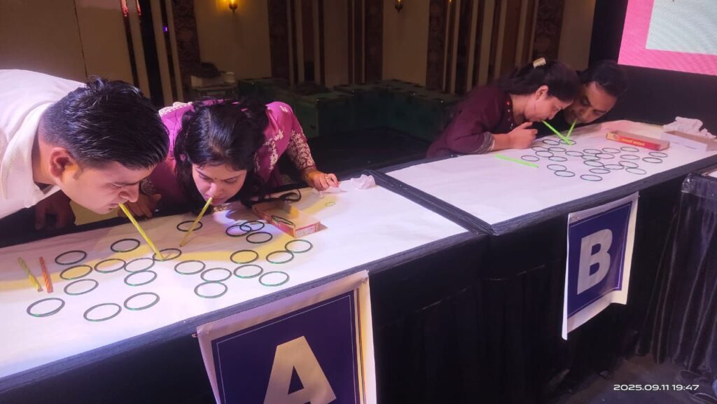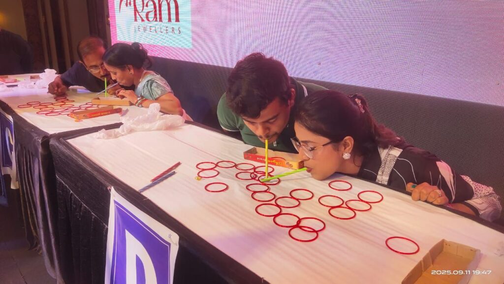 आज 120 कपल्स ने मनोरंजन खेलों का भरपूर आनंद उठाया। फुगा फूलाते ,चूड़ी पहनो प्रतियोगिता, में महिलाओं में ज्यादा उत्साह दिखाएं। अनेक सवालों के जवाब भी दिए। कपल्स ने मुंह में दो पेंसिल फंसा कर डोली चूड़ियां बॉक्स में डालने, गिलास सजाने ,व अन्य खेलों का आनंद लिया।