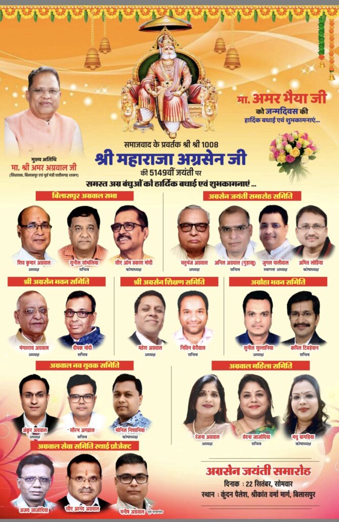 मुख्य अतिथि बिलासपुर विधायक अमर अग्रवाल के द्वारा प्रतियोगिता में शामिल होने वाले विजेताओं को आकर्षक उपहार प्रदान करेंगे। समाज के विभूतियों को सम्मानित करेंगे । इस कार्यक्रम में अग्रसेन महाराज जयंती समारोह अग्रवाल नव युवक समिति, अग्रवाल महिला समिति के अलावा अग्रवाल समाज के शिक्षण समिति ,भवन समिति अग्रोहा समिति तथा सेवा समिति के पदाधिकारी साल भर के सामाजिक कार्य का लेखा-जोखा प्रस्तुत करेंगे। अग्रसेन जयंती के अवसर पर अग्रसेन जयंती समारोह के द्वारा उसका डिटेल भी दिया हुआ है शहर में जगह-जगह भंडारा का आयोजन किया गया है जिसमें गायत्री मदिर के पास विनोबा नगर, मुरारका भवन के सामने श्रीकांत वर्मा मार्ग में, अग्रवाल खाद भंडार तोरवा, रायपुर रोड ए एस फन सके सामने, स्टेट बैंक के सामने नया सरकंडा मुख्यमार्ग, मानव सेवा मंगला, व्यापार विहार, जेपी रेजिडेंसी के सामने देवरी खुर्द तोरवा, लायंस क्लब सीएमडी कॉलेज चौक में कल सुबह 10:00 बजे से अग्रवाल समाज के द्वारा भंडारा का आयोजन किया गया। अग्रसेन जयंती पर अग्रवाल समाज के द्वारा दस हजार से अधिक के लिए भंडारा की व्यवस्था की है । इसके पहले कल सुबह 9 बजे अग्रवाल अग्रसेन जयंती समारोह अग्रवाल नवयुवक समिति अग्रवाल सभा, अग्रवाल महिला समिति एवं अग्रवाल समाज की विभिन्न समितियां के पदाधिकारी एवं सदस्य सदस्य अग्रसेन चौक में भगवान महाराजा अग्रसेन जी की मूर्ति पर माल्यार्पण कर पूजा अर्चना एवं महा आरती करेंगे और उसके बाद शहर में 10 स्थानों पर भोग भंडारा का आयोजन किया जाएगा। विधायक अमर अग्रवाल के जन्मदिन पर अग्रवाल समाज केद्वारा भव्य सम्मान किया जाएगा। केक काटकर समाज के द्वारा उनका जन्मदिन मनाया जाएगा। जयंती के लिए समाज में काफी उत्साह है।