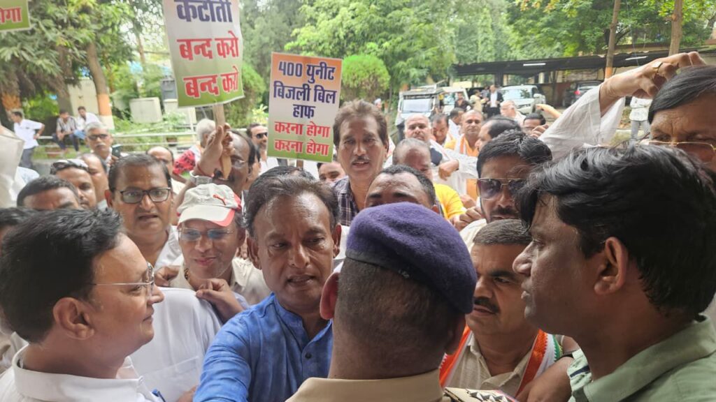 सुबह 11 बजे से ही बिजली कार्यालय के बाहर भारी पुलिस बल तैनात था। दोपहर करीब डेढ़ बजे कांग्रेसियों का काफिला कार, बाइक और स्कूटरों में नारेबाजी करते हुए तिफरा पहुंचा। उनके हाथों में तख्तियां थीं जिन पर लिखा था…